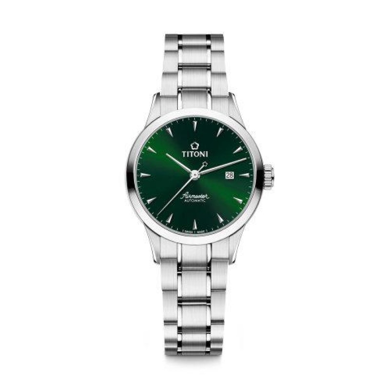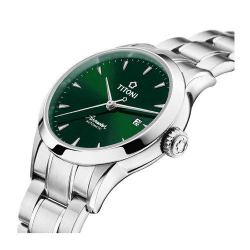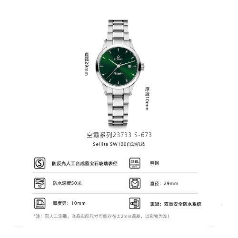 TITONI/梅花瑞士手表 空霸系列 时尚优雅休闲商务款 自动机械女表 29mm绿盘钢带 23733 S-673
