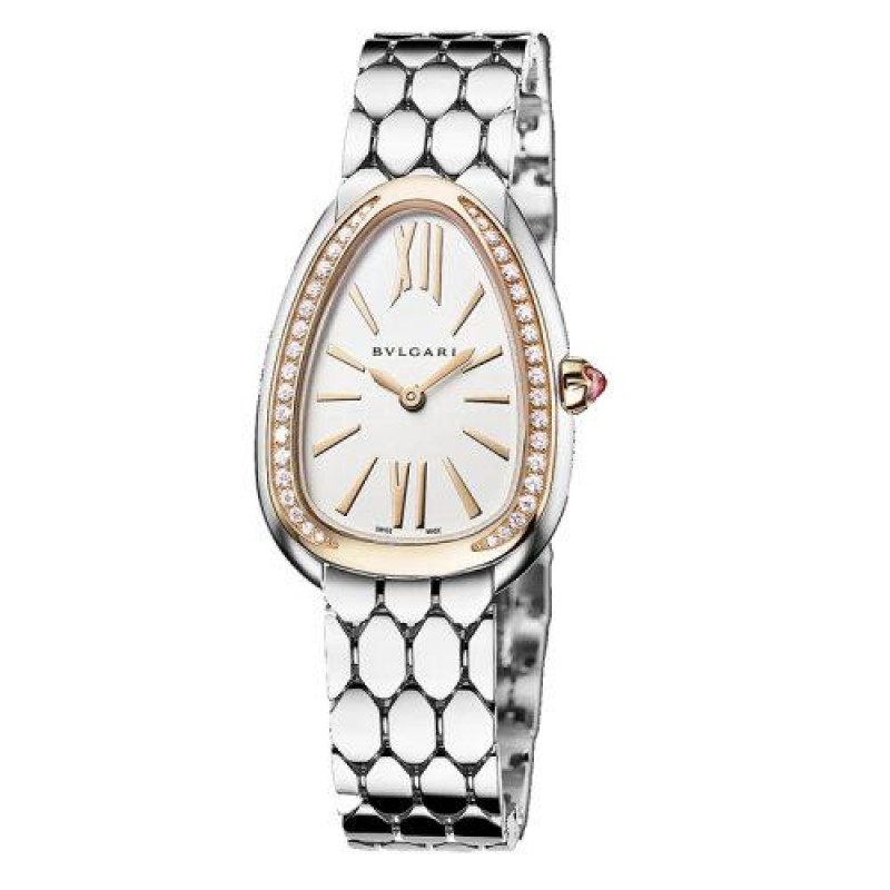 【包税】预定2-3周 BVLGARI/宝格丽 带有不锈钢表壳和表链 18K金玫瑰金表圈镶有钻石和银白色乳白色表盘 SERPENTI SEDUTTORI石英手表 33毫米 103143