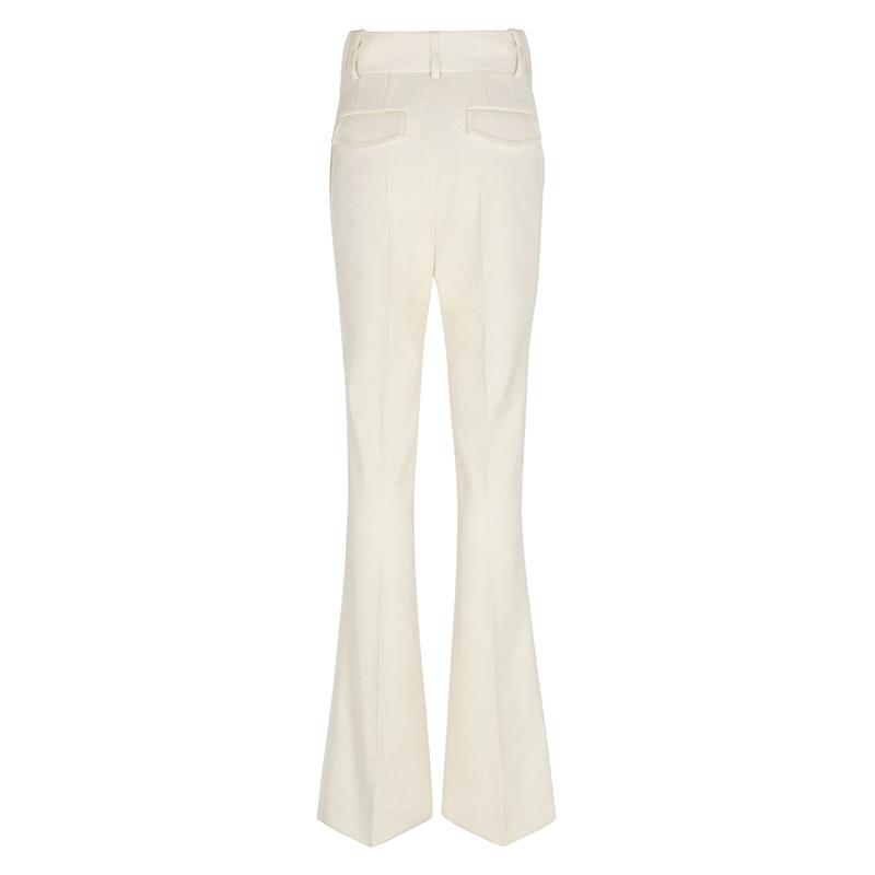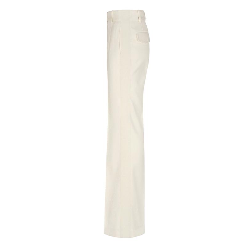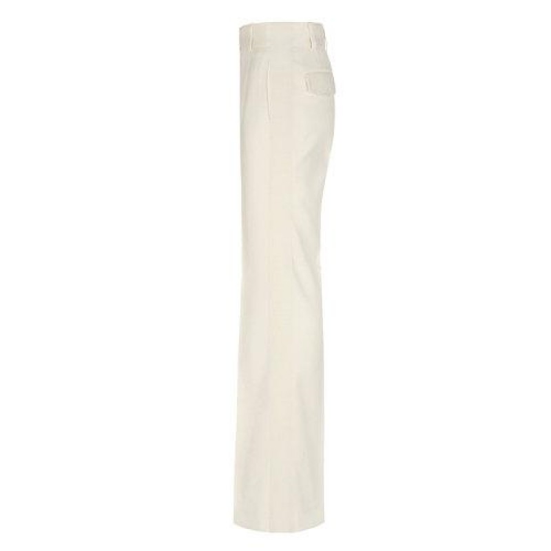 白色高腰喇叭裤,主要采用日本斜纹羊毛混纺等材质,两侧点缀宽幅同系配色罗缎饰带,正面饰立体竖式缝线。2个侧面口袋,背面2个翻盖口袋。