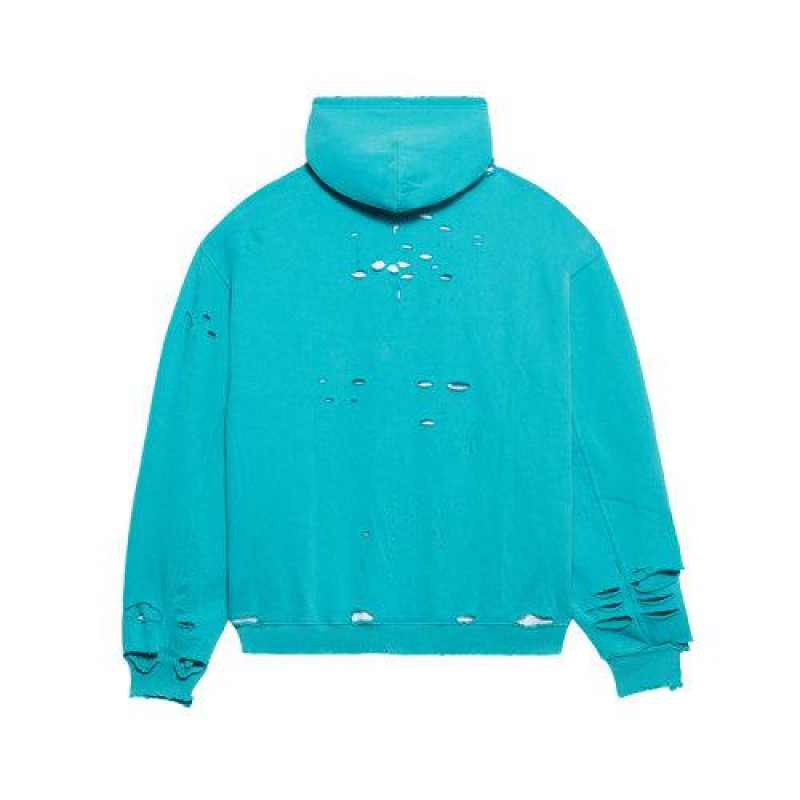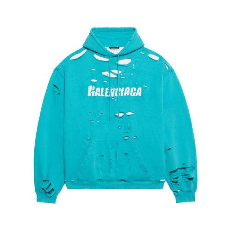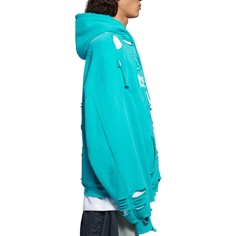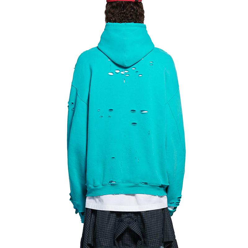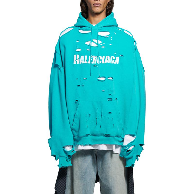 【包税】Balenciaga/巴黎世家 21早春新款男士蓝色撕裂效果连帽大码卫衣 659403TKVB64661