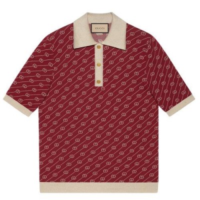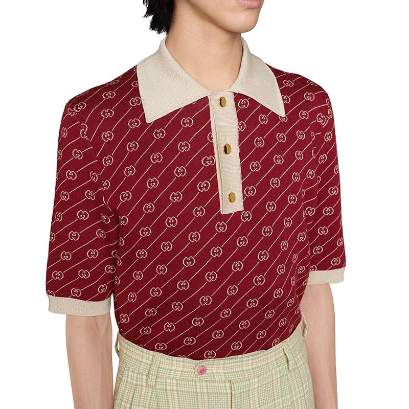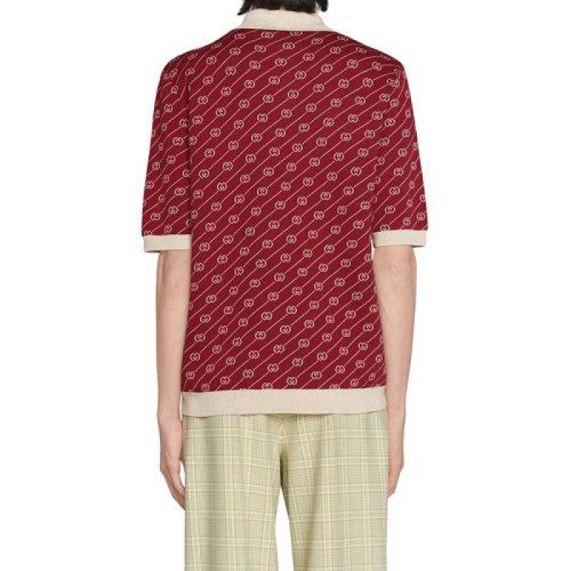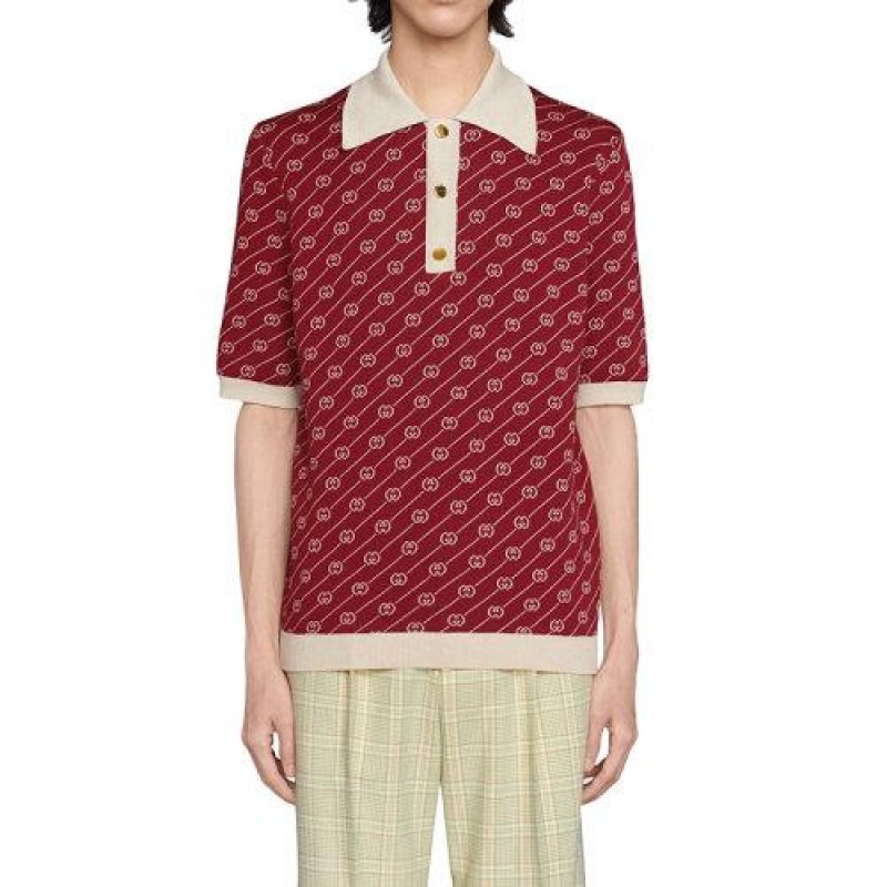 【包税】GUCCI/古驰 21年春夏新款 男士GG酒红色棉质和真丝对角提花短袖polo衫655100XKBWA6064