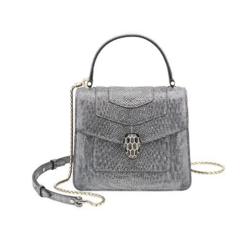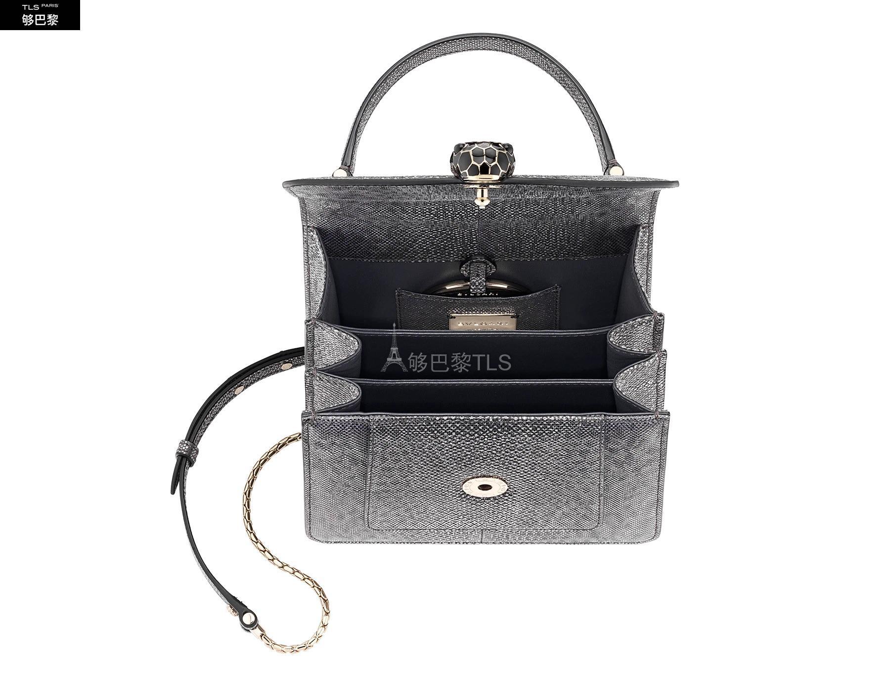 Ce sac a bandouliere Serpenti Forever en karung raffine a finition metallisee couleur Charcoal Diamond illustre le talent des artisans Bvlgari a transformer des materiaux precieux en des pieces intemporelles. Le fermoir emblematique Serpenti hypnotise avec ses ecailles en email couleur Charcoal Diamond scintillant et noir brillant et ses yeux en onyx au cha*W*rme envoutant. Sac a main dote de trois compartiments a soufflet et d’une chaine ondulante en forme de serpent ajustable et amovible pour un look polyvalent. Petit modele avec un miroir de poche. Dimensions : 18 x 15 x 9,5 cm.