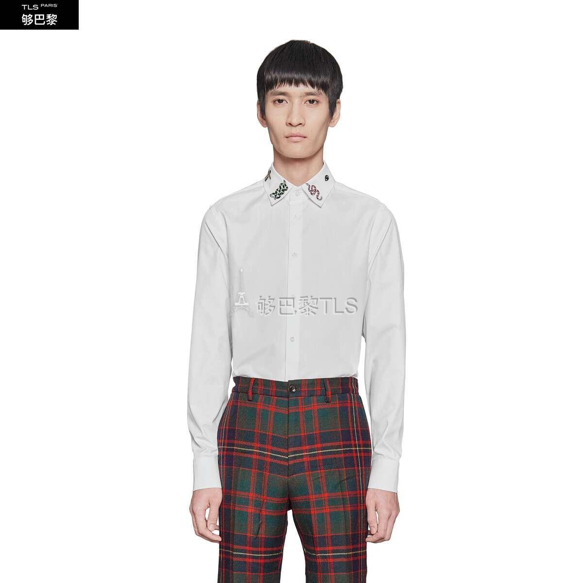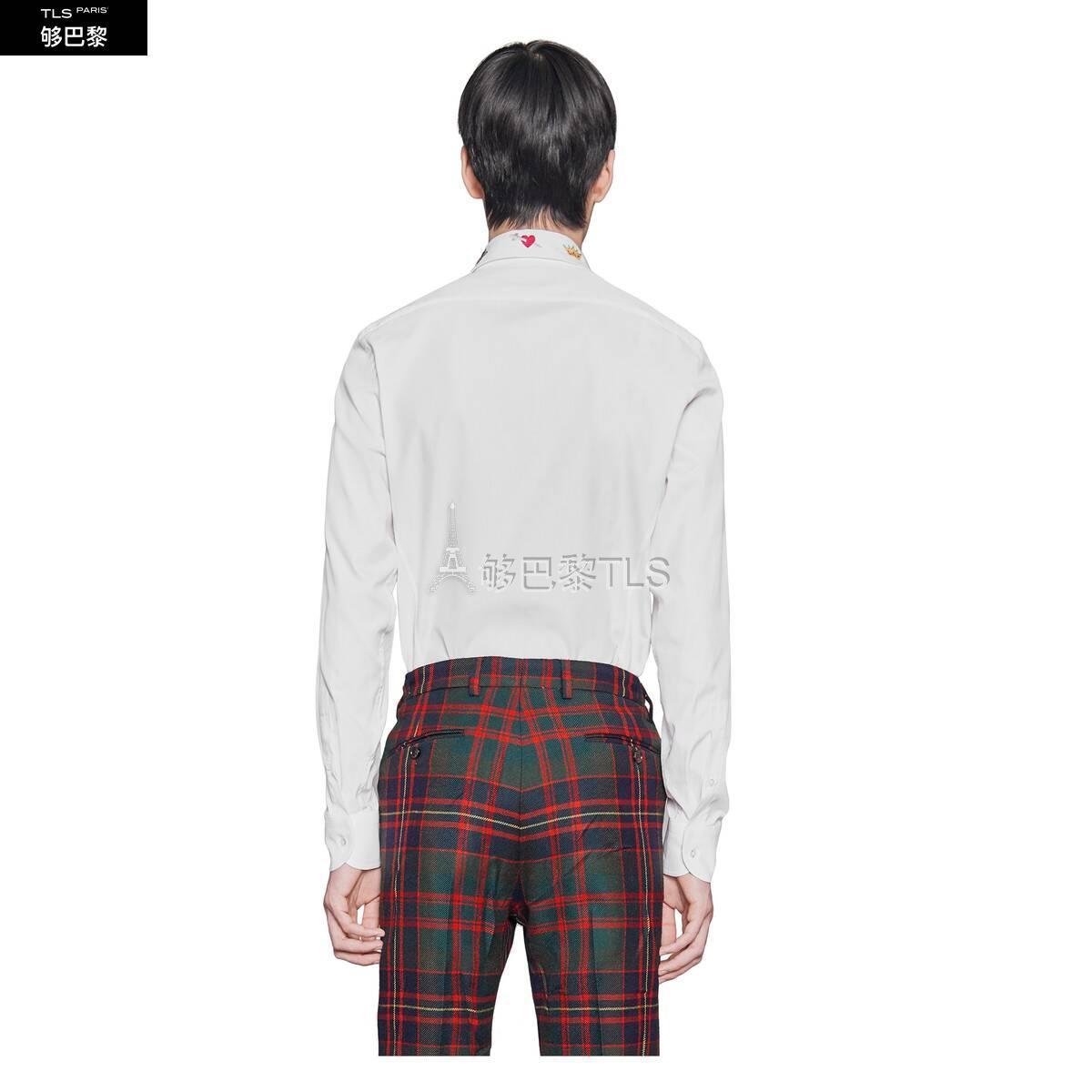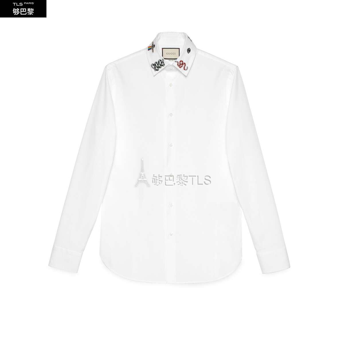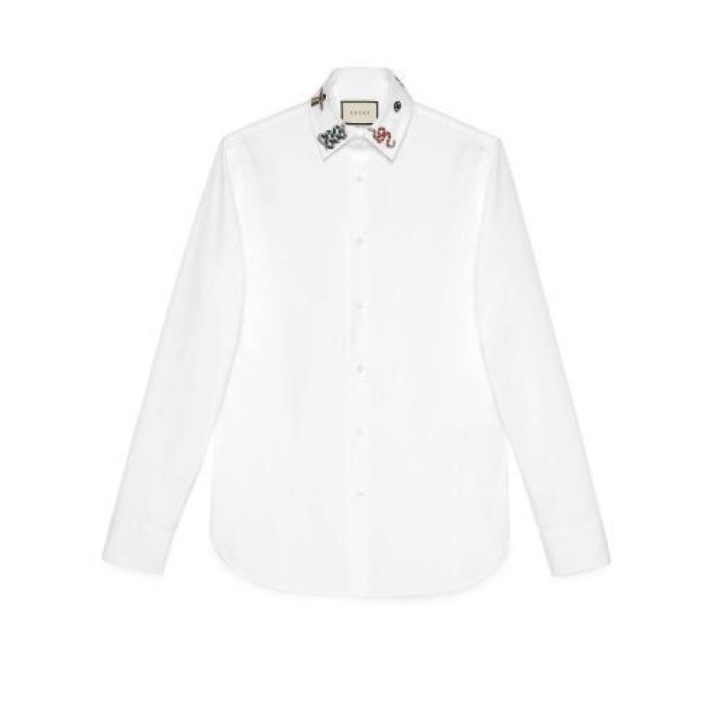 作为贯穿Gucci近期系列的特色细节,珊瑚蛇、眼睛、UFO等元素以刺绣方式装饰这件衬衫的衣领。