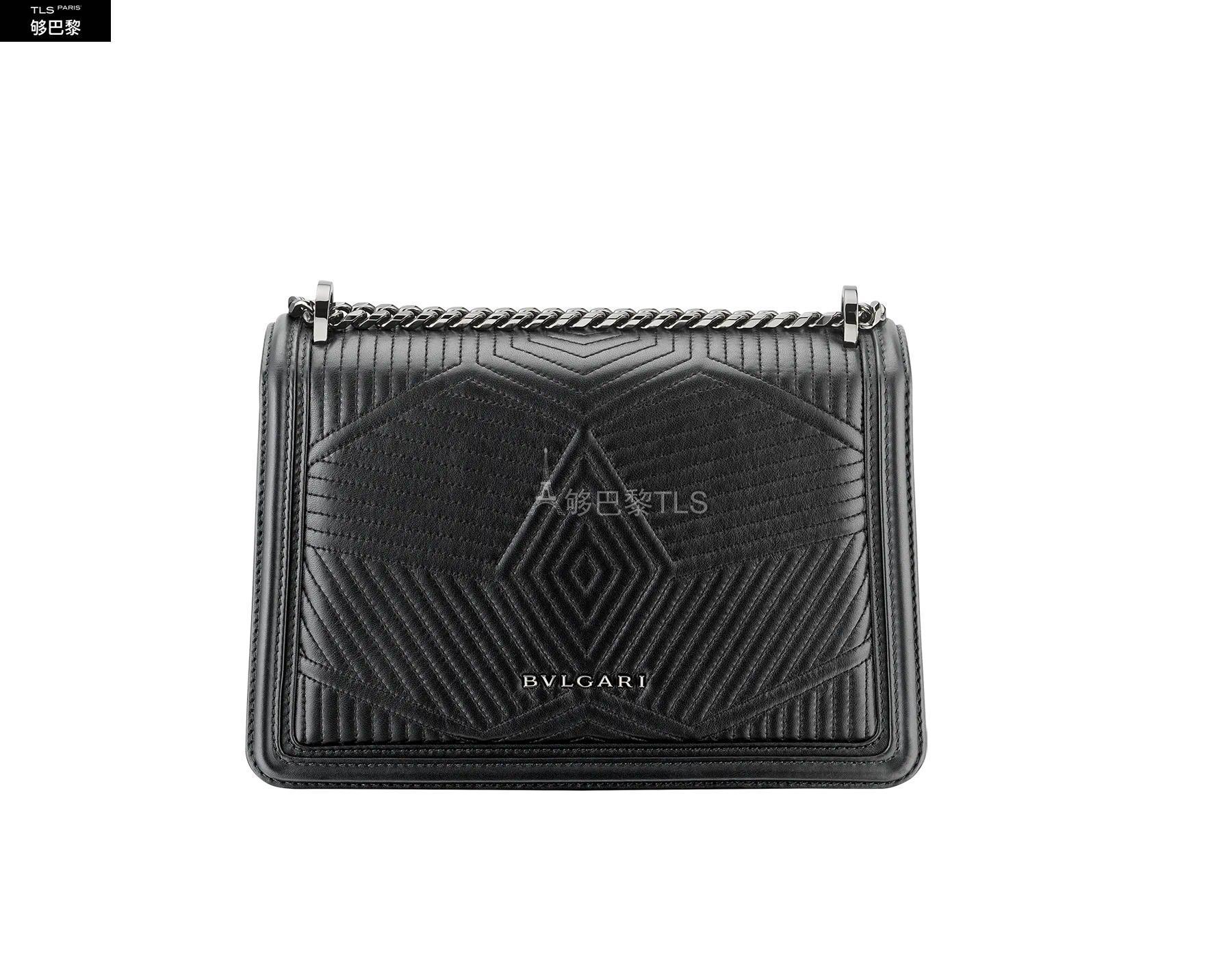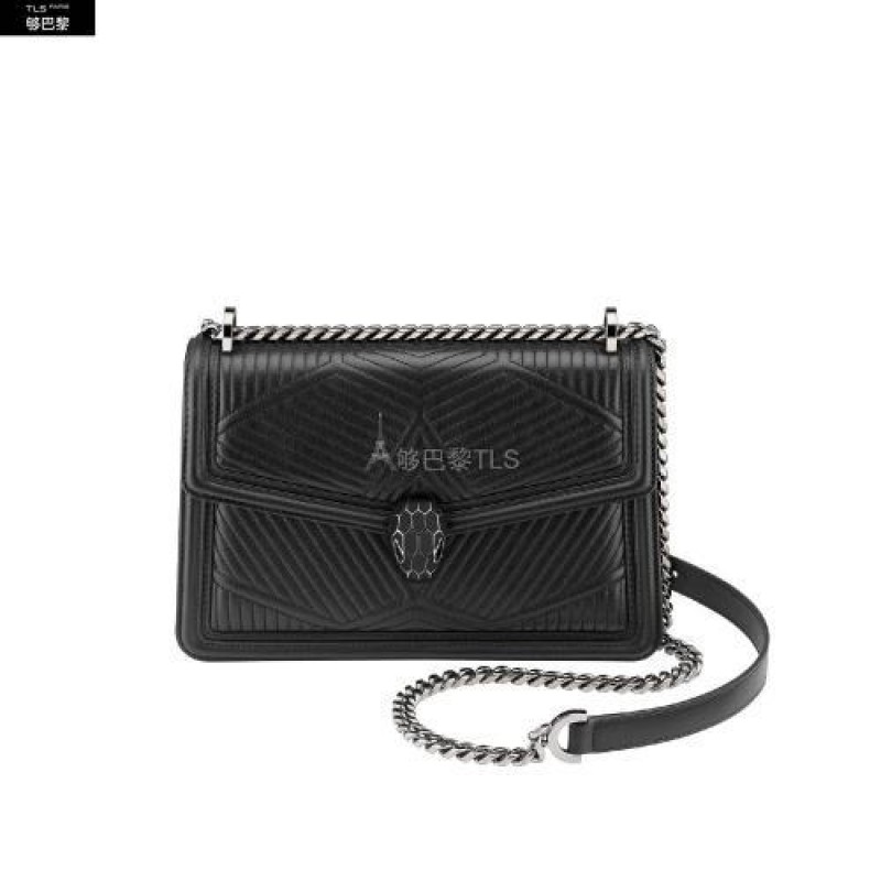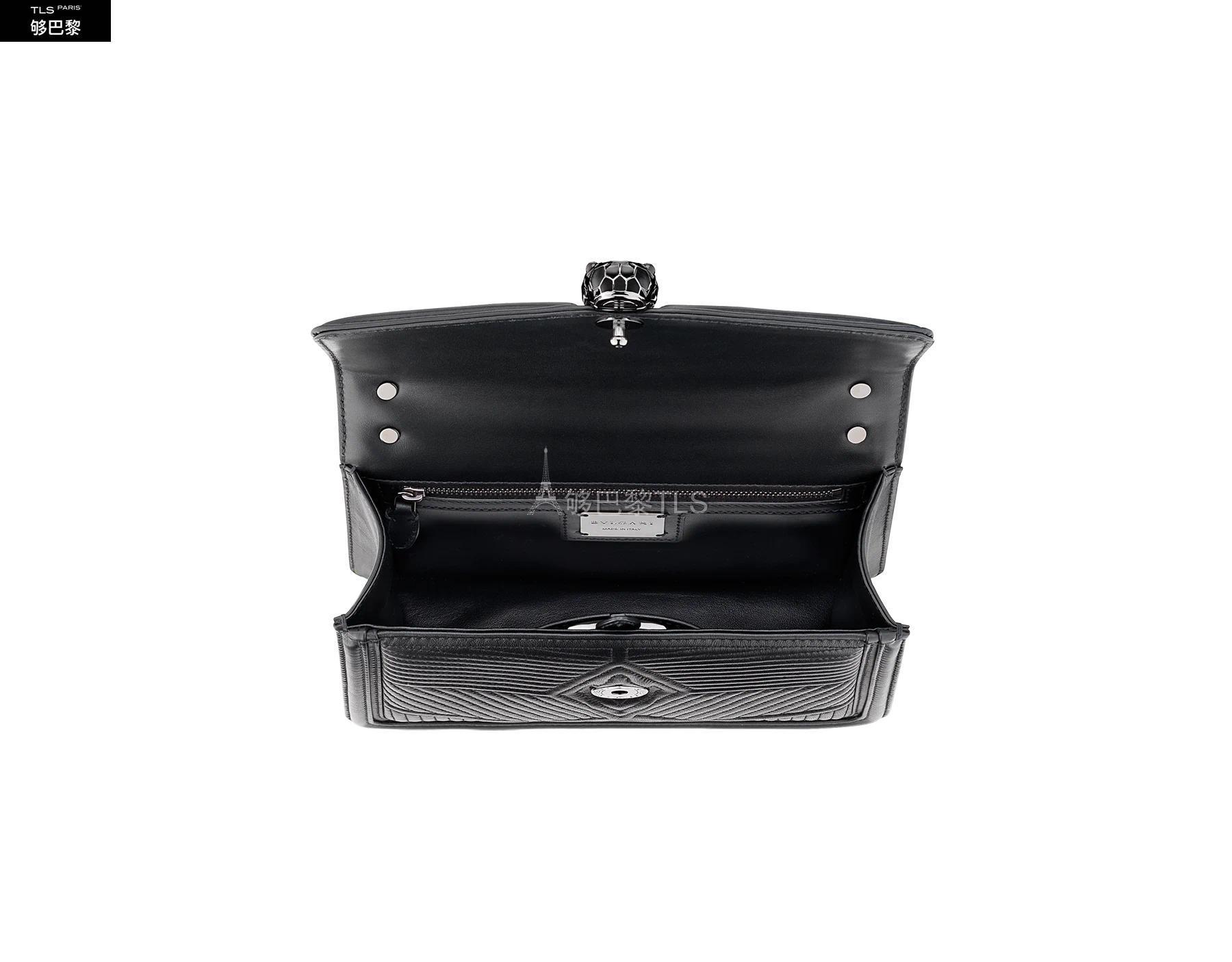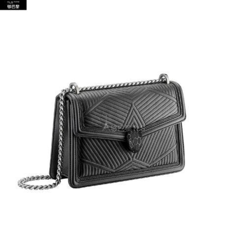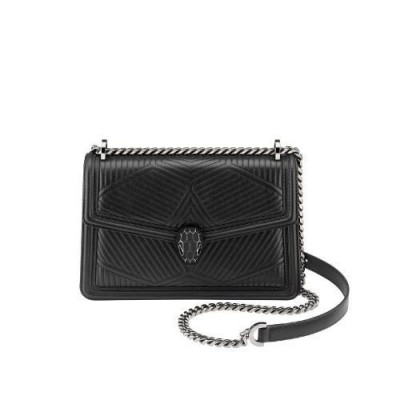 Caracterise par des lignes nettes contrastant avec originalite avec un motif exclusif legerement *w*matelasse, le sac a bandouliere Serpenti Diamond Blast est revisite dans une version tout en noir. Le corps du sac en cuir nappa noir est habille d'un motif *w*matelasse en trois dimensions, inspire des nombreuses facettes d'un diamant brillant, tandis que son profil externe est rehausse d'un pourtour geometrique en cuir de veau lisse ton sur ton. Fermoir emblematique Serpenti en laiton plaque ruthenium fonce et email noir entierement mat avec yeux en onyx elegants. Accessoire ideal d’un look de jour sophistique, le sac se pare d’une chaine epaisse coulissante dite « gourmette » et d’une bandouliere en cuir ajustable pour plus de polyvalence. Petit modele dote d’un compartiment a soufflet, d’une poche a miroir et d’une poche a fermeture eclair a l’interieur. Une plaque en met