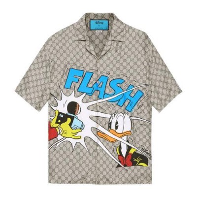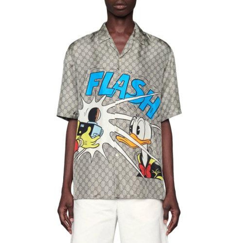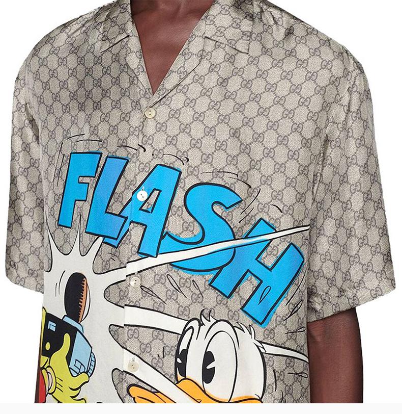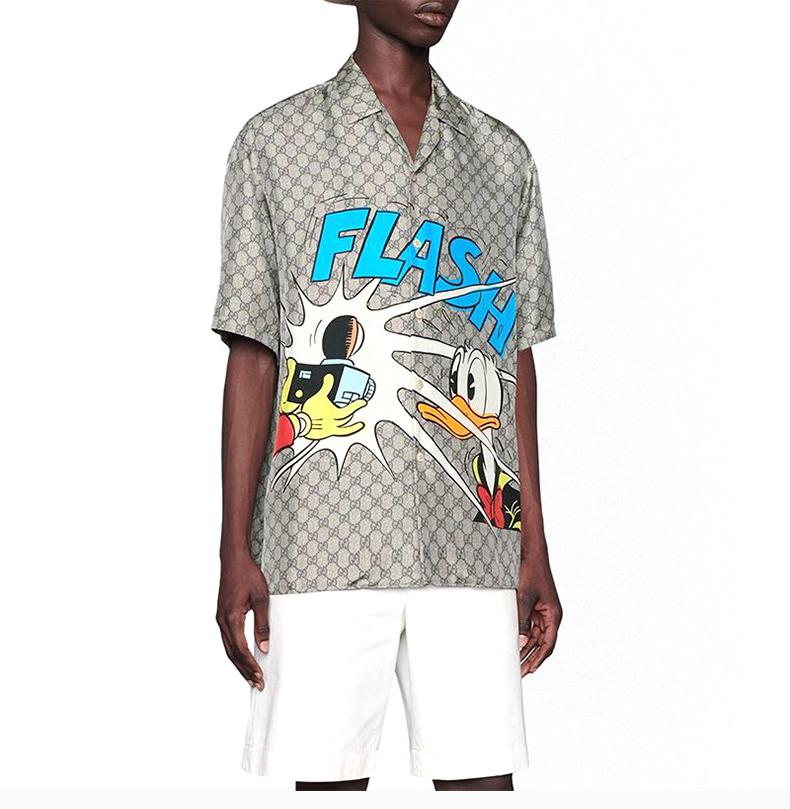 GUCCI 古驰 男士 服装 21春夏 米色翻领格纹唐老鸭图案短袖衬衫 男士短袖衬衫