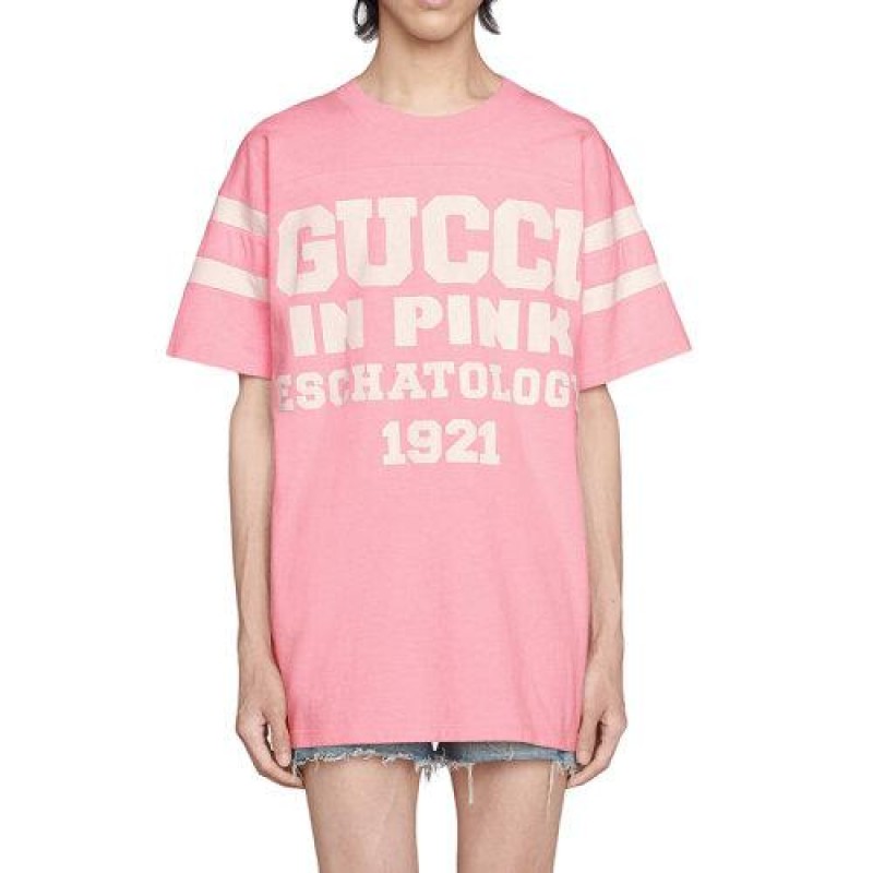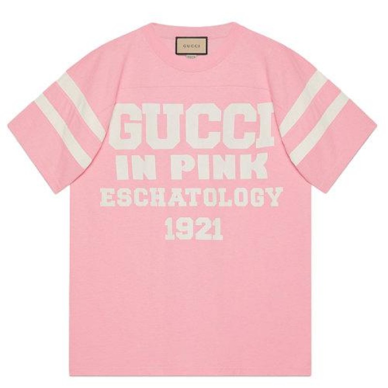 • 浅粉红色重量级石洗棉质汗布,配以白色Gucci 1921“ Gucci Eschatology in Pink”和“ 25”印花