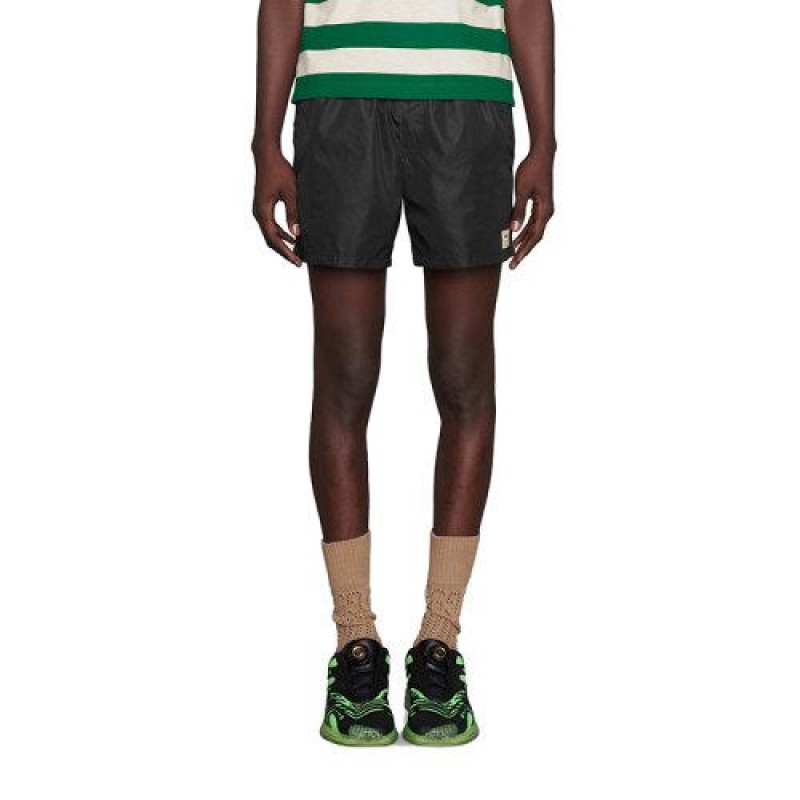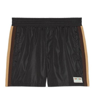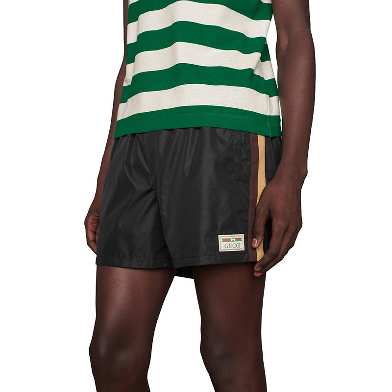 这款游泳短裤由防水尼龙制成,设有松紧腰带和抽绳。两侧的棕色和米色条纹给Gucci提花商标带来运动感。