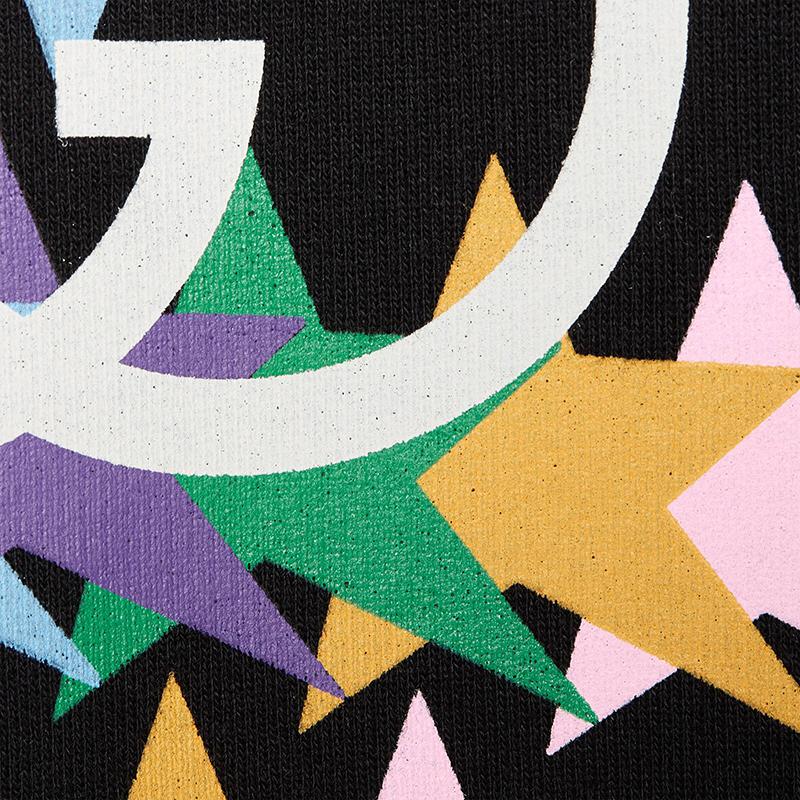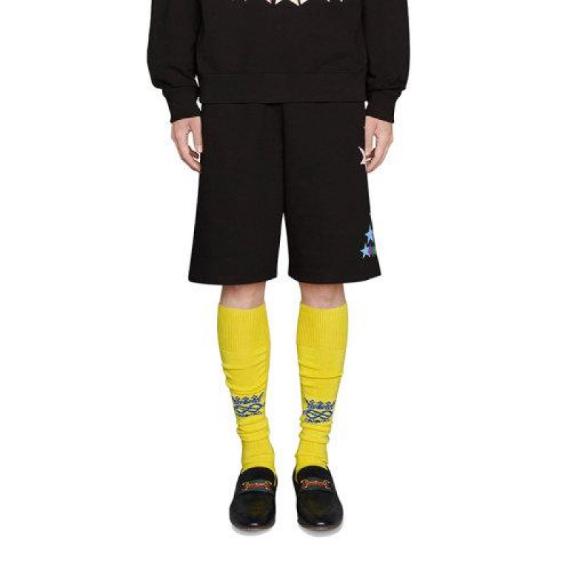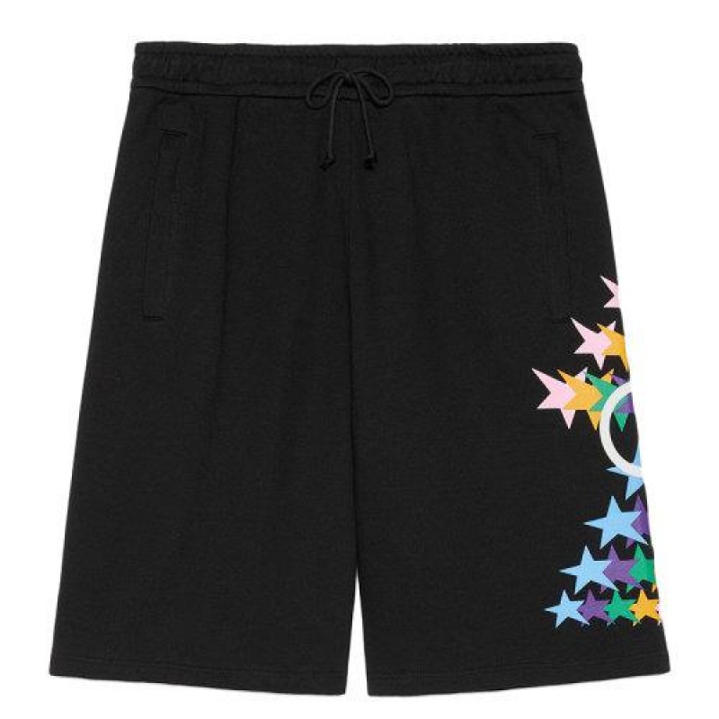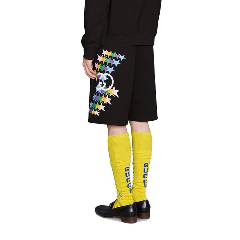 在夜空的启发下,点缀着彩虹星的图案定义了整个Opening系列所重现的模特。棉质短裤的侧面饰有发光的GG星星印花。