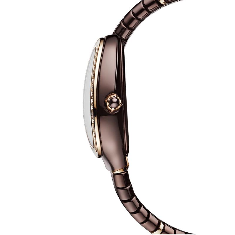 Serpenti Spiga手表将Serpenti的胆识与Spiga的传奇相结合,将传统与现代融合。设计具有当代感,象征意义纯属罗马,手镯本身上刻有小麦图案的耳朵代表无限。这款时尚的陶瓷珠宝钟表彰显了宝格丽使用原始材料的能力。Serpenti Spiga石英机芯手表,35毫米弧形棕色陶瓷表壳(经特殊处理),18K金玫瑰金表圈镶有钻石,18K金玫瑰金表冠镶有凸圆形切割陶瓷元素,棕色表盘,手链棕色陶瓷螺旋,经过特殊处理和18K金玫瑰金元素。