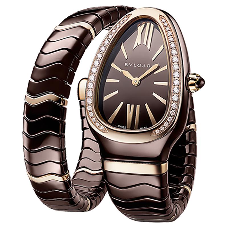 【包税】预定2-3周 BVLGARI/宝格丽 镶有钻石的18K金玫瑰金表圈和棕色陶瓷表带和表带 棕色表盘 Serpenti Spiga螺旋形石英手表 35毫米 103060