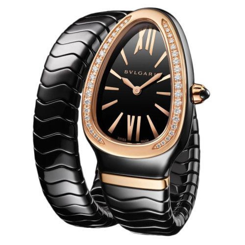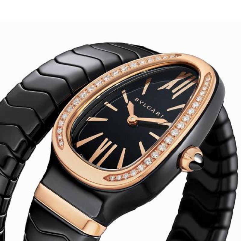 【 Tax included 】 Book 2-3 weeks BVLGARI/Bulgari black ceramic case 18K gold rose gold bezel with bright cut diamonds and black ceramic spiral bracelet, black baked paint dial, SERPENTI SPIGA quartz watch 35mm 102532