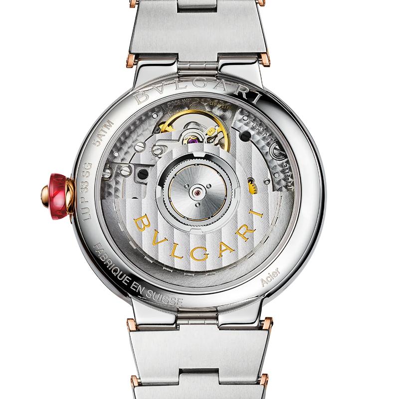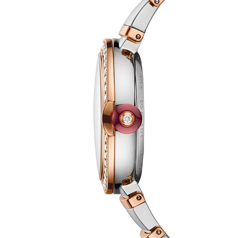 受光与时间之间不可分割的联系的启发,LVCEA向日d致敬,日sun是植根于古罗马传统的古老的时间测量工具之一。LVCEA在意大利以“ luce”作为光的力量的体现,以其结合传统与现代的圆形表壳的光彩夺目。每一枚时计的表冠均镶有彩色宝石,是罗马珠宝商的特色标志。LVCEA腕表,具有机械制造机芯,自动上链,33毫米不锈钢表壳,18K金玫瑰金表圈镶有明亮式切割钻石,18 K金玫瑰金表冠镶有凸圆形切割合成红宝石和钻石,白色珍珠母贝表盘,镶有钻石的时标,18K金玫瑰金和精钢表链。