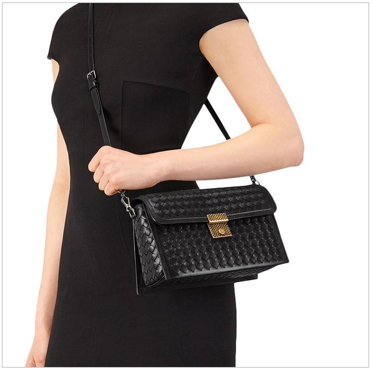 Bottega Veneta/葆蝶家 INTRECCIATO系列女士黑色羊皮经典编织款时尚翻盖小号单肩包斜挎包邮差包女包 463700-AUQ3-1000