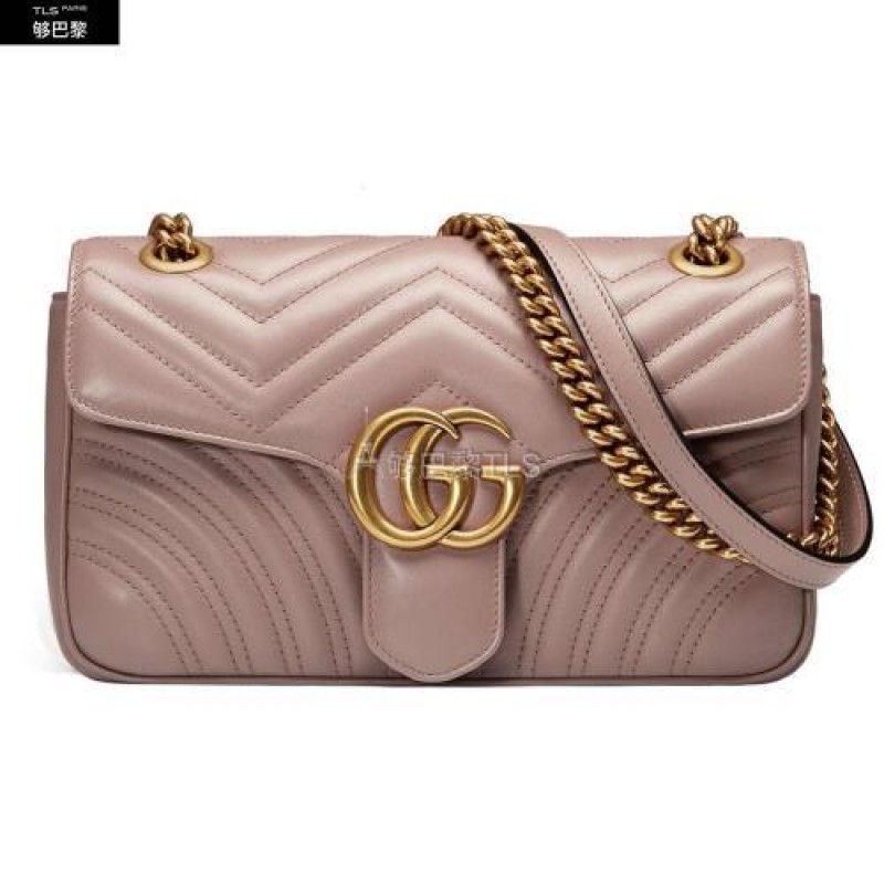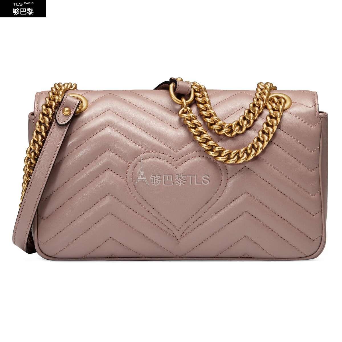 小号GG Marmont金属链肩背包,结构柔软,超大翻盖门襟,点缀双G配件。滑链背带设计精巧,背法多样,可在肩背和手提之间自由转换。绗缝V型皮革材质,背面饰有心形图案。