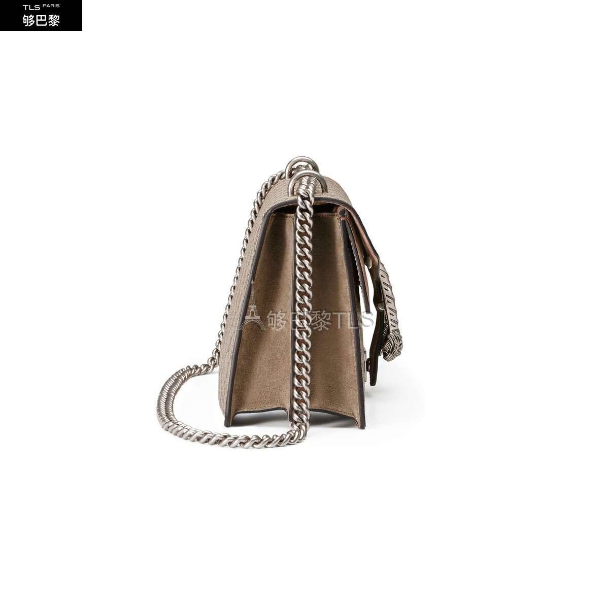 织纹虎头马刺扣为这款有结构感的肩背包增添光彩。滑动链条包带有多种背法,可在肩背和手提之间自由转换。