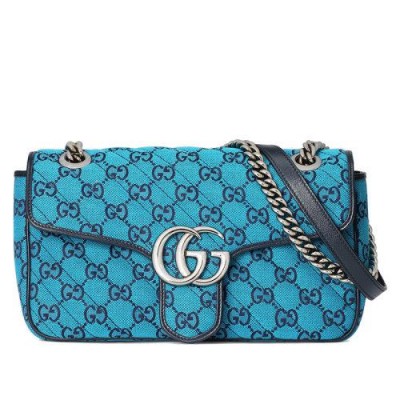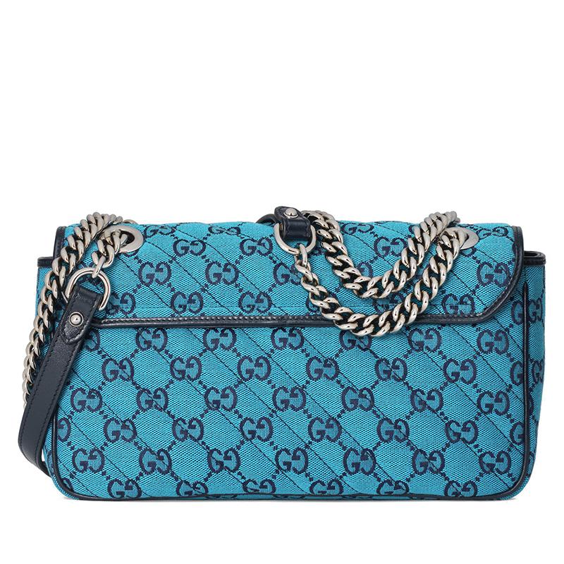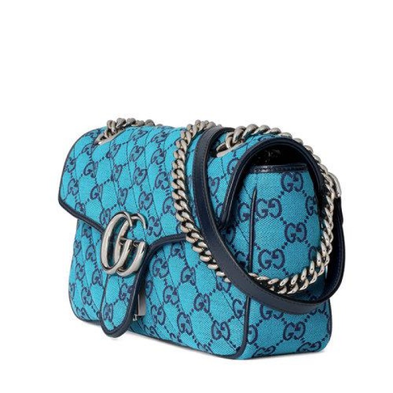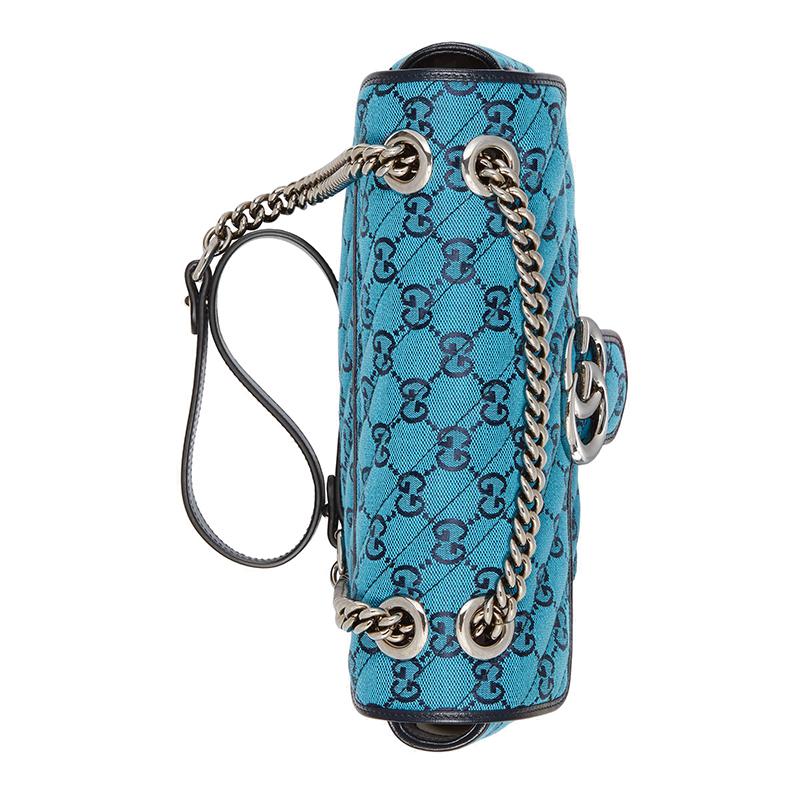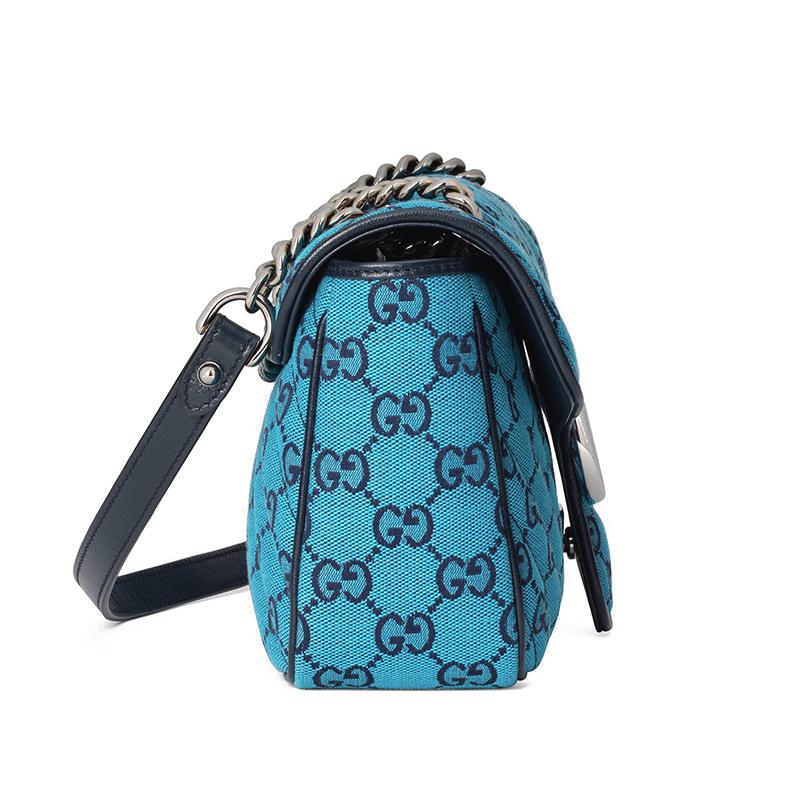 【包税】GUCCI/古驰 2021春夏新款 GG Marmont‎系列 小号女士浅蓝色和蓝色GG帆布银色饰面双G扣斜挎单肩手提包4434972UZCN4164