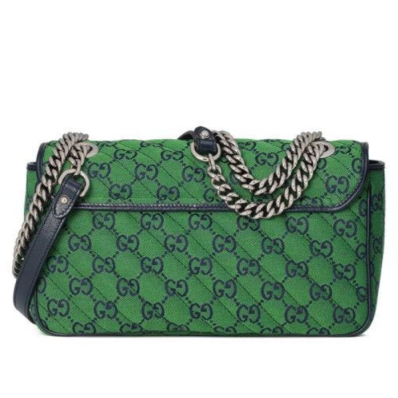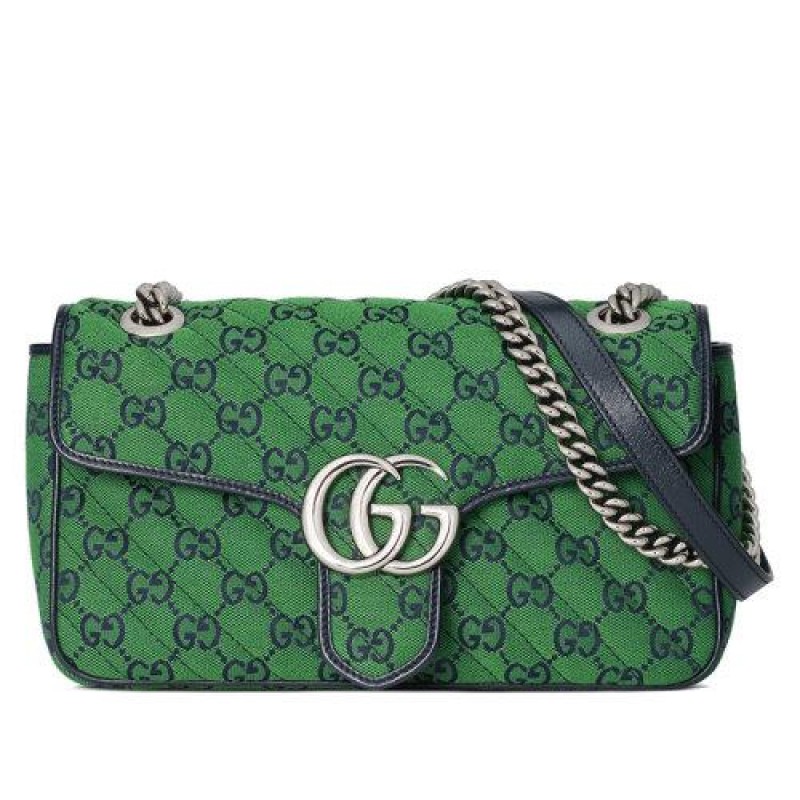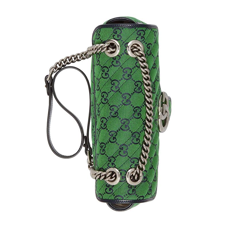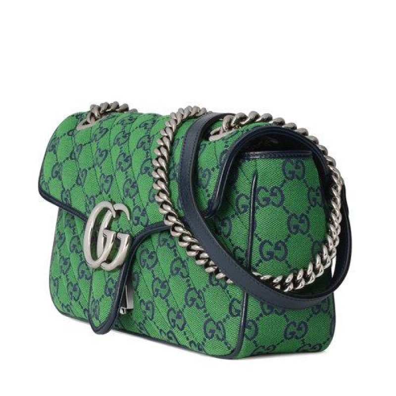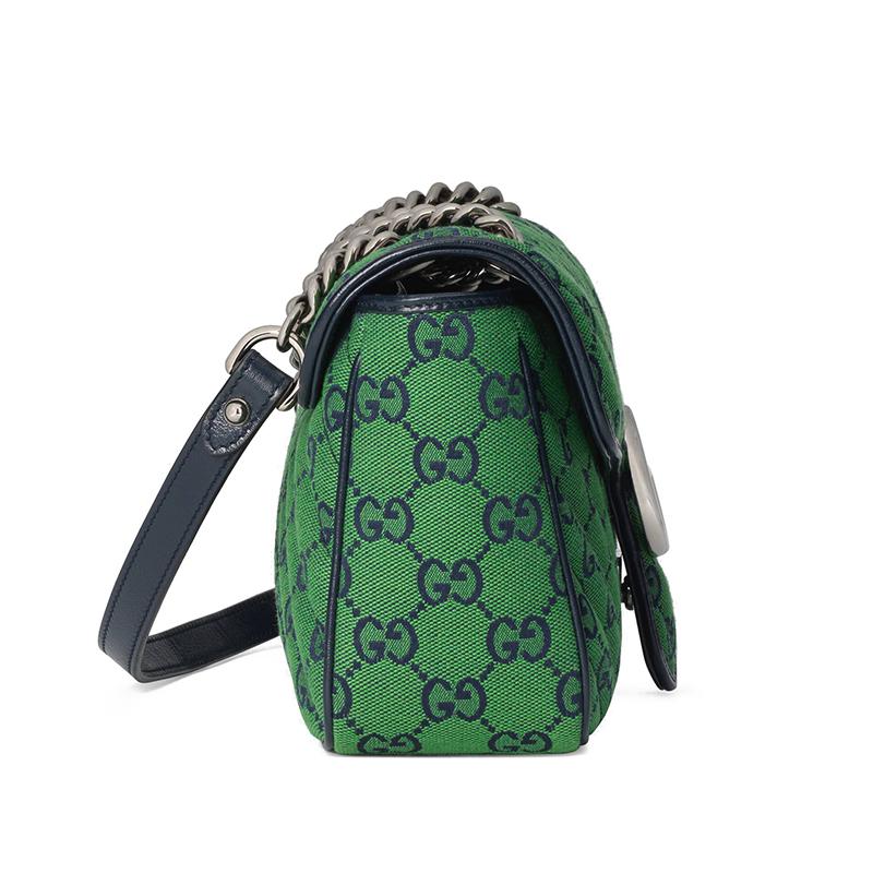【包税】GUCCI/古驰 2021春夏新款 GG Marmont‎系列 小号女士绿色和蓝色GG帆布银色饰面双G扣斜挎单肩手提包4434972UZCN3368