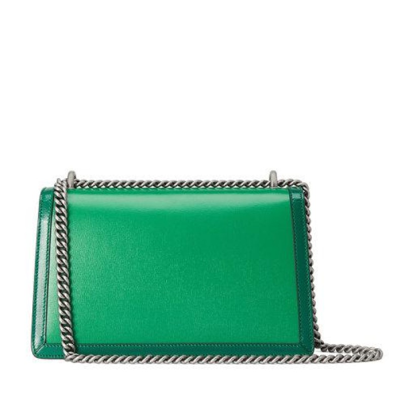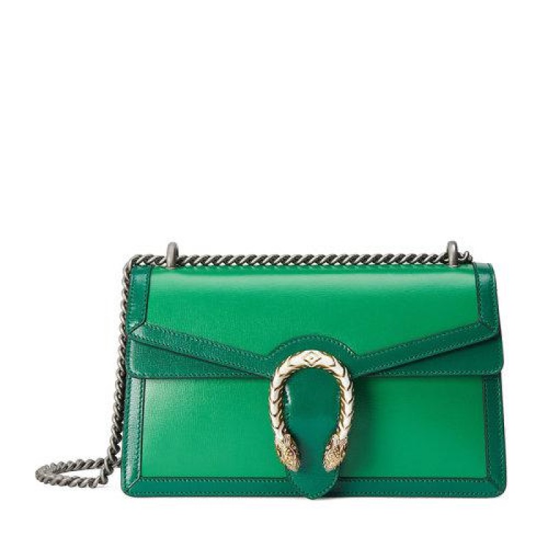 Beloved系列的标志性轮廓装饰有鲜艳的色彩和宝石味。狄奥尼索斯(Dionysus)以绿色皮革制成,并饰有其特色的虎头式金扣。闪亮的搪瓷增强了质感的细节