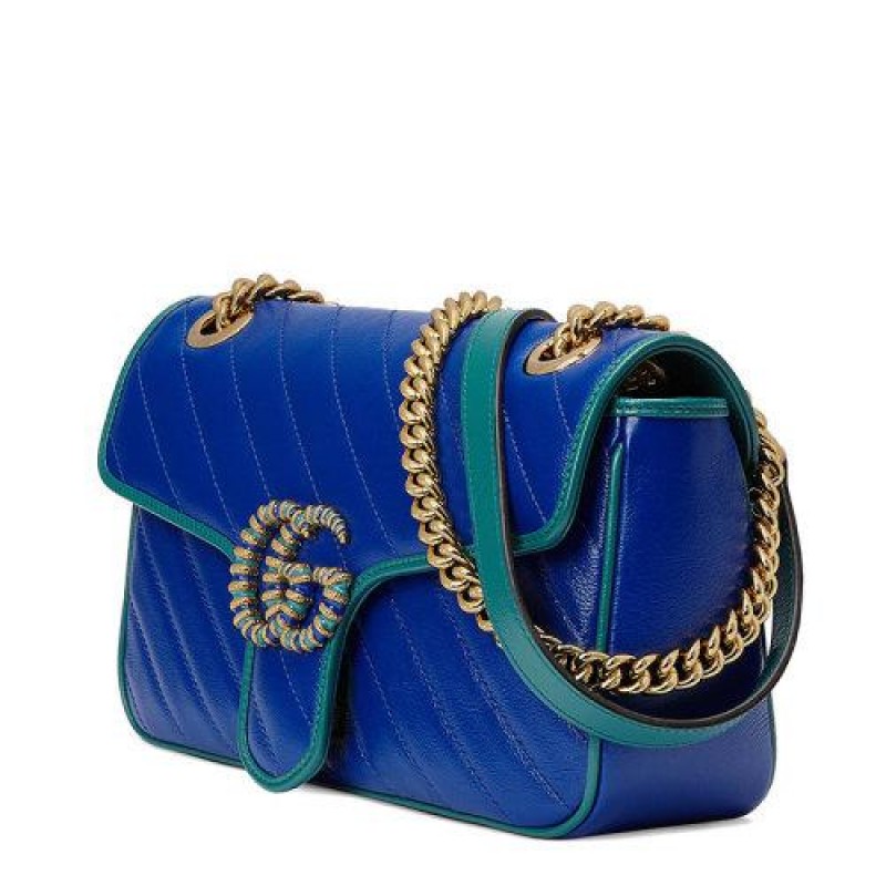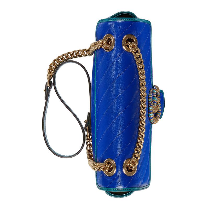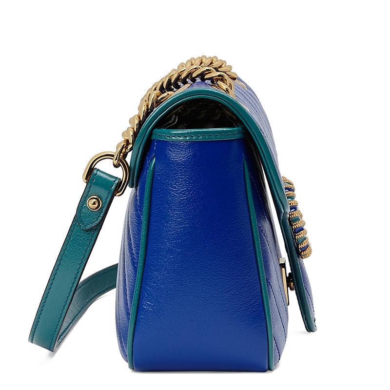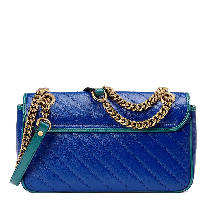 【包税】GUCCI/古驰 2021春夏新款 GG Marmont系列 女士小号蓝色和绿松石皮革翻盖珐琅双G单肩斜挎手提包4434971X5EG8382