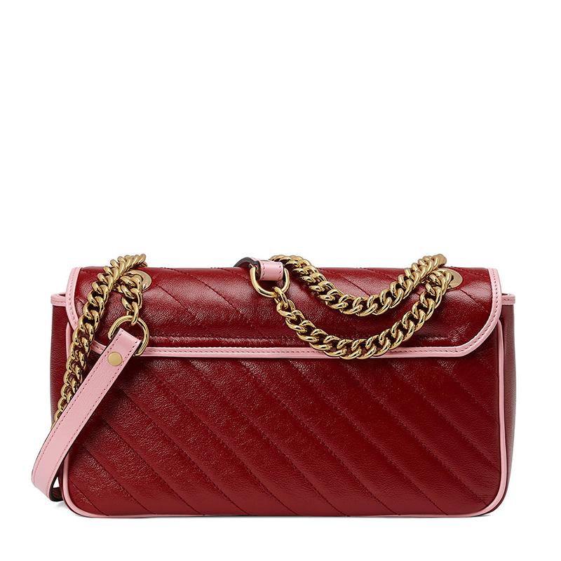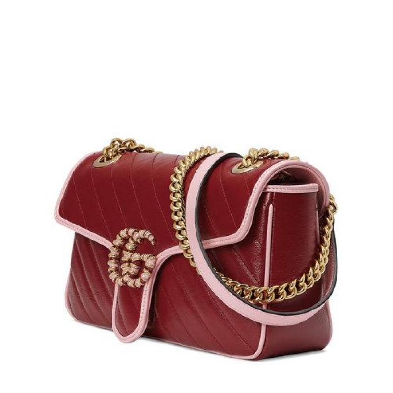 GG Marmont皮革以深红色的阴影和精致的柔和粉红色完成,让人回想起珍贵的红宝石的颜色。单肩包以其标志性的Double G细节为特色,并增加了色调细节。