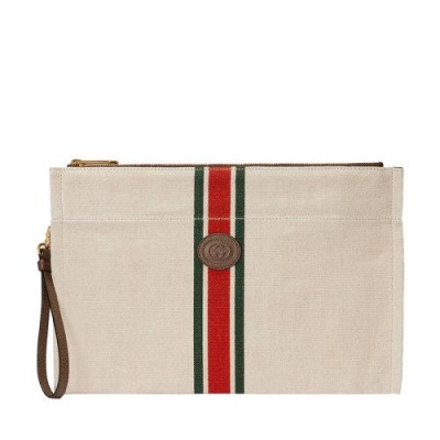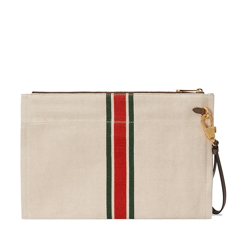 【包税】GUCCI/古驰 21春夏新款 男士米色亚麻红绿条纹GG皮革标志拉链手拿包6575922U2AG8686