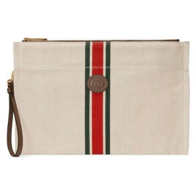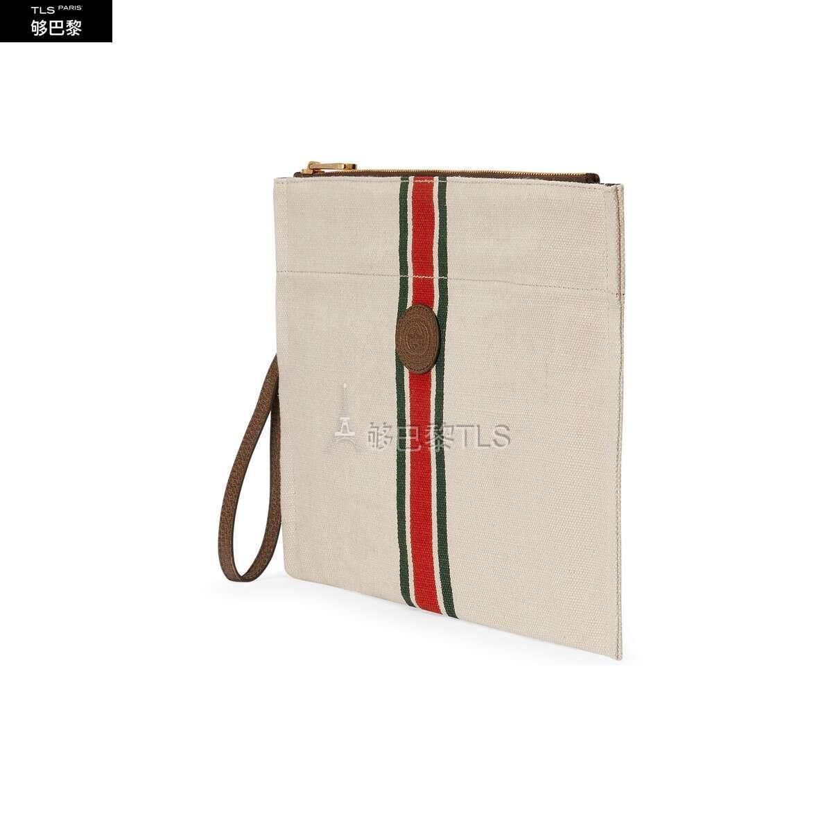 这款手拿包采用米色亚麻面料制作,饰以精致的典藏细节。皮革标签上饰有双G字母交织图案细节,旨在致敬品牌创始人GuccioGucci先生,融合红绿织带细节,为整款设计注入强大的标识内涵。