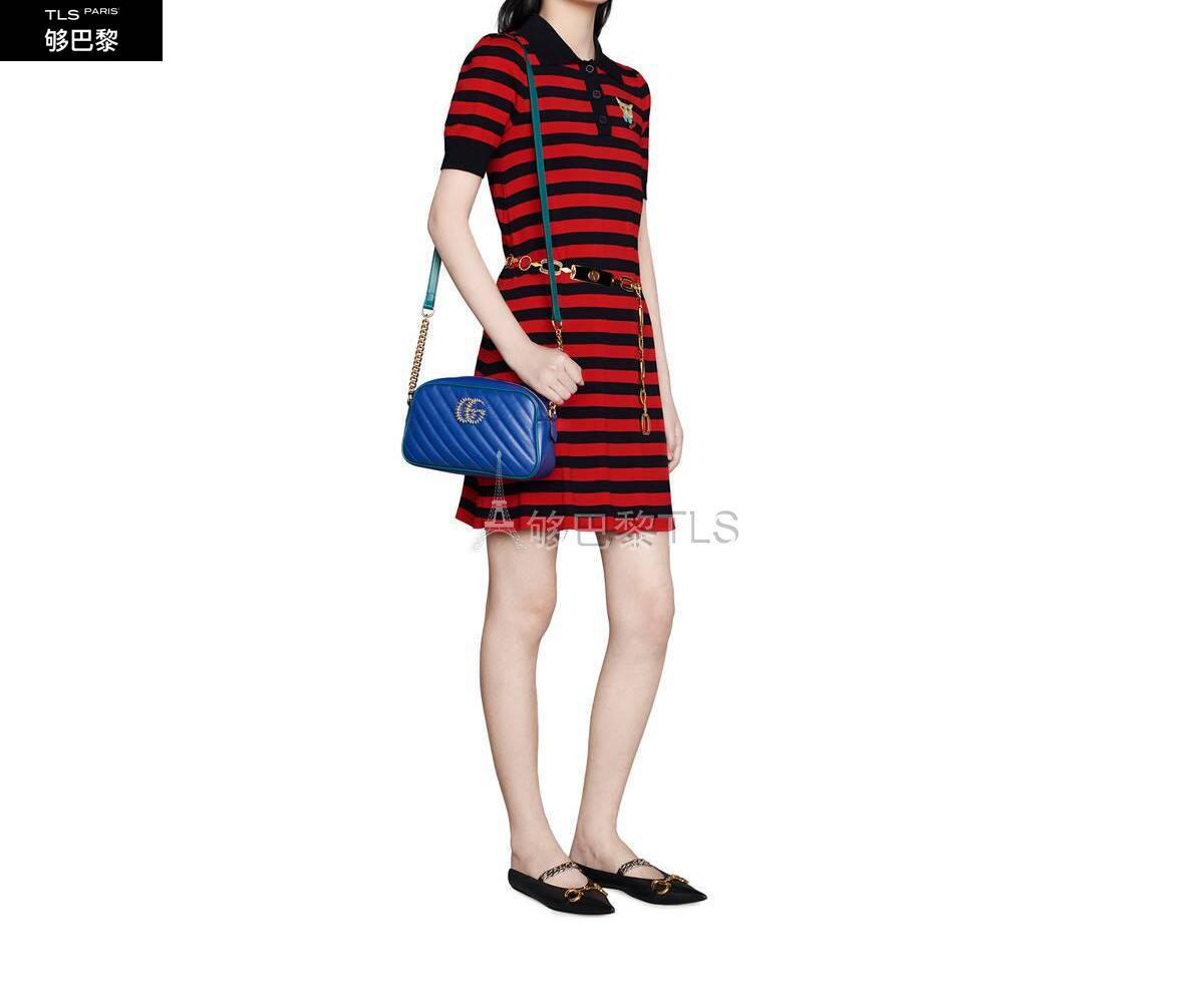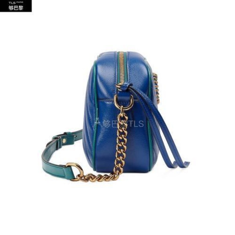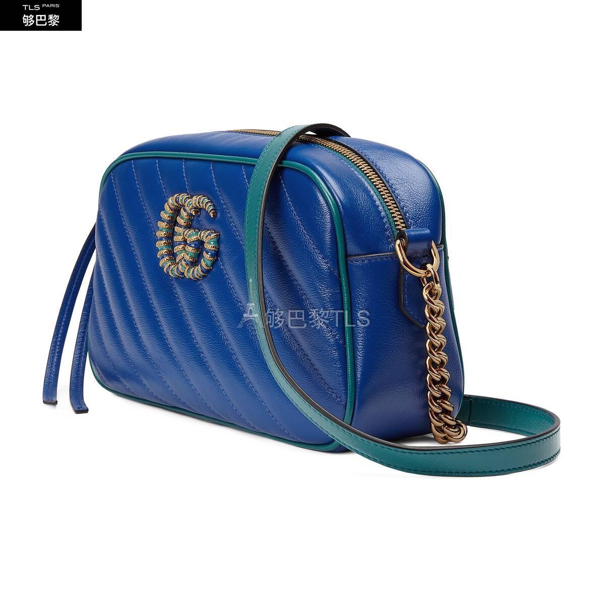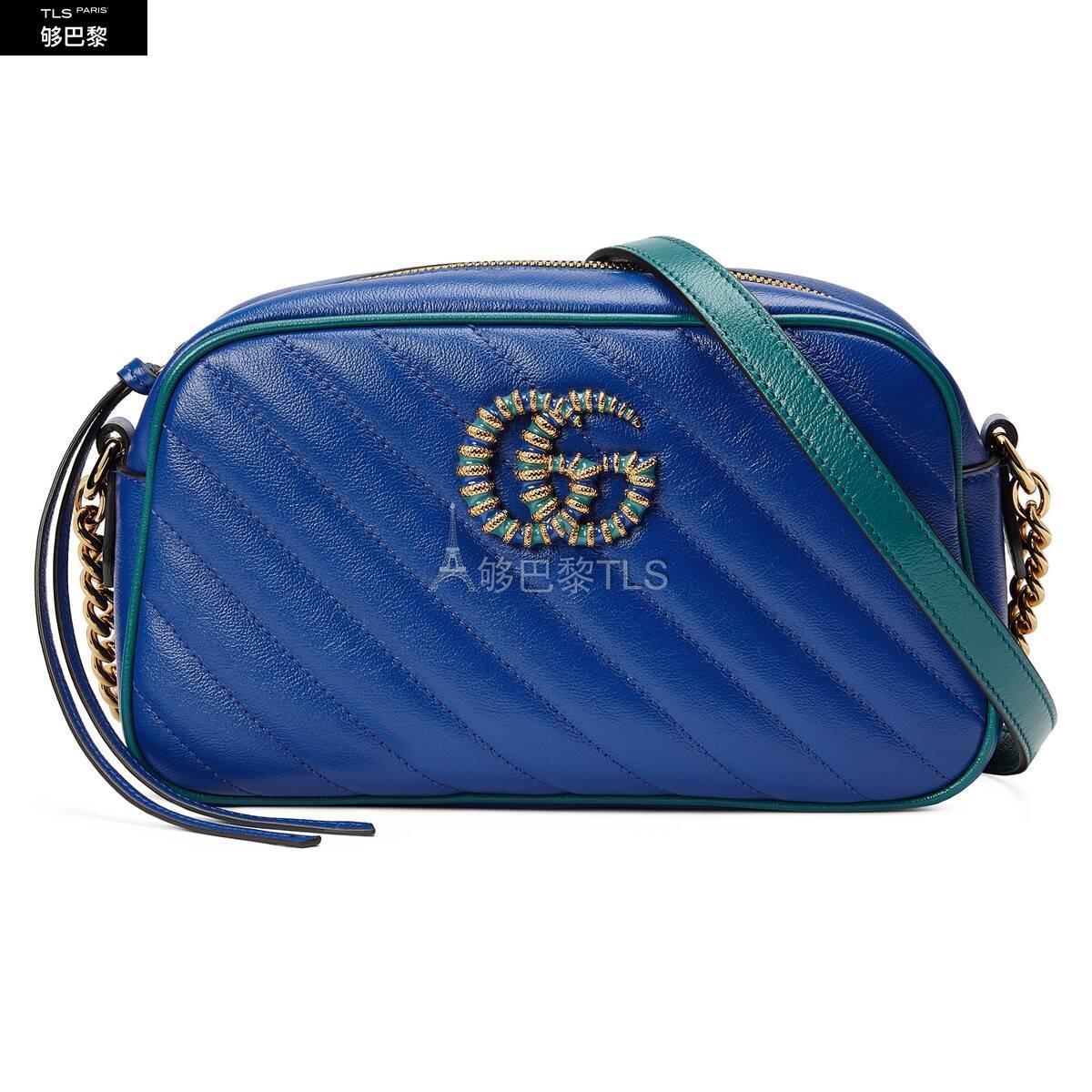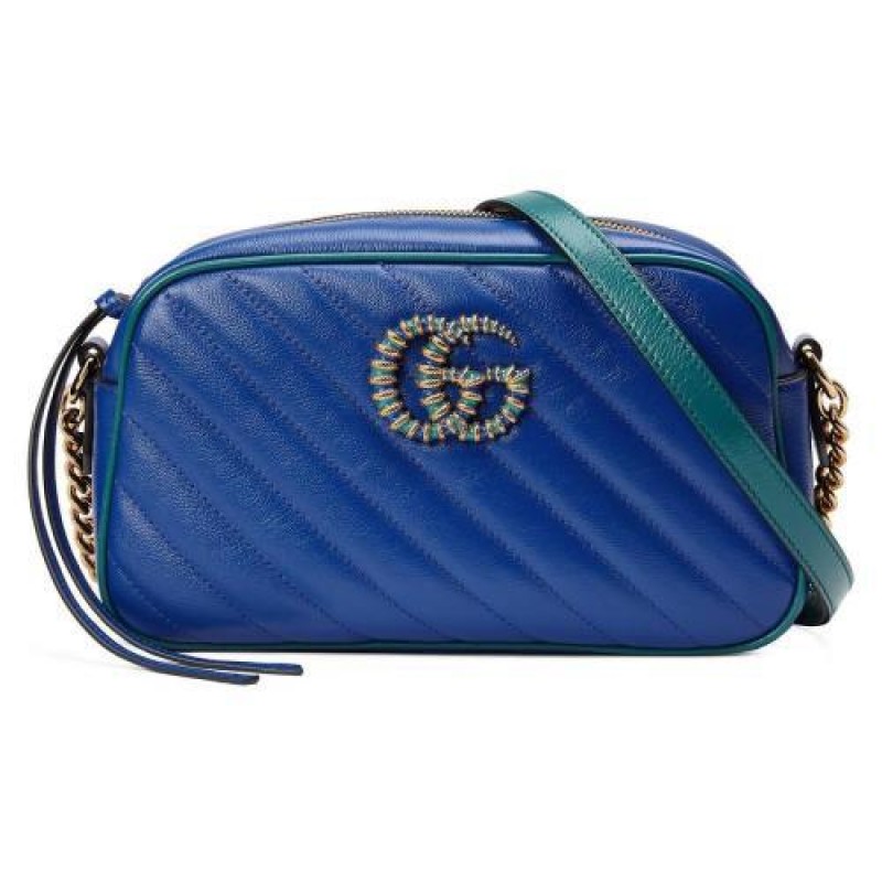 这款GGMarmont手袋采用蓝色皮革材质搭配绿色滚边,令人联想起美丽珍贵的蓝宝石和绿翡翠。彩色珐琅为该系列的标志性双G配件增添了丰富的层次感。长方形造型搭配链条肩带,打造斜挎或肩背的多样化携带选择。