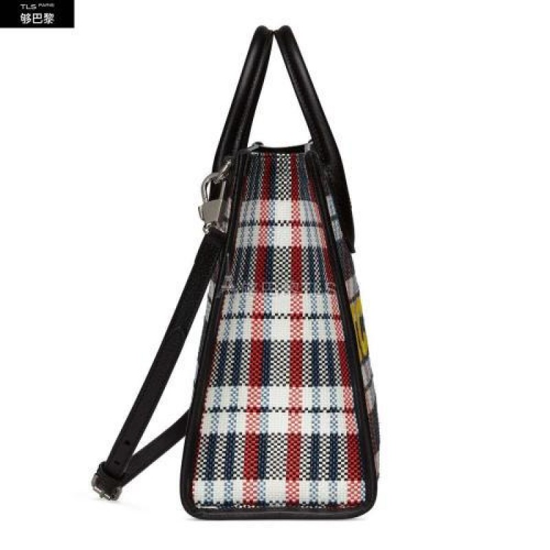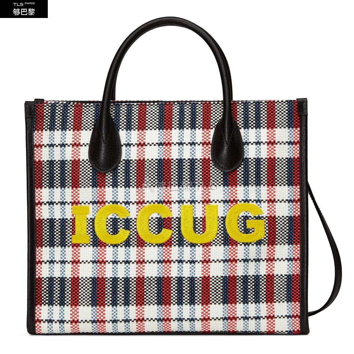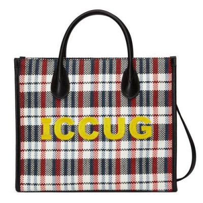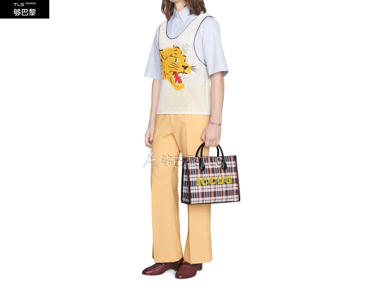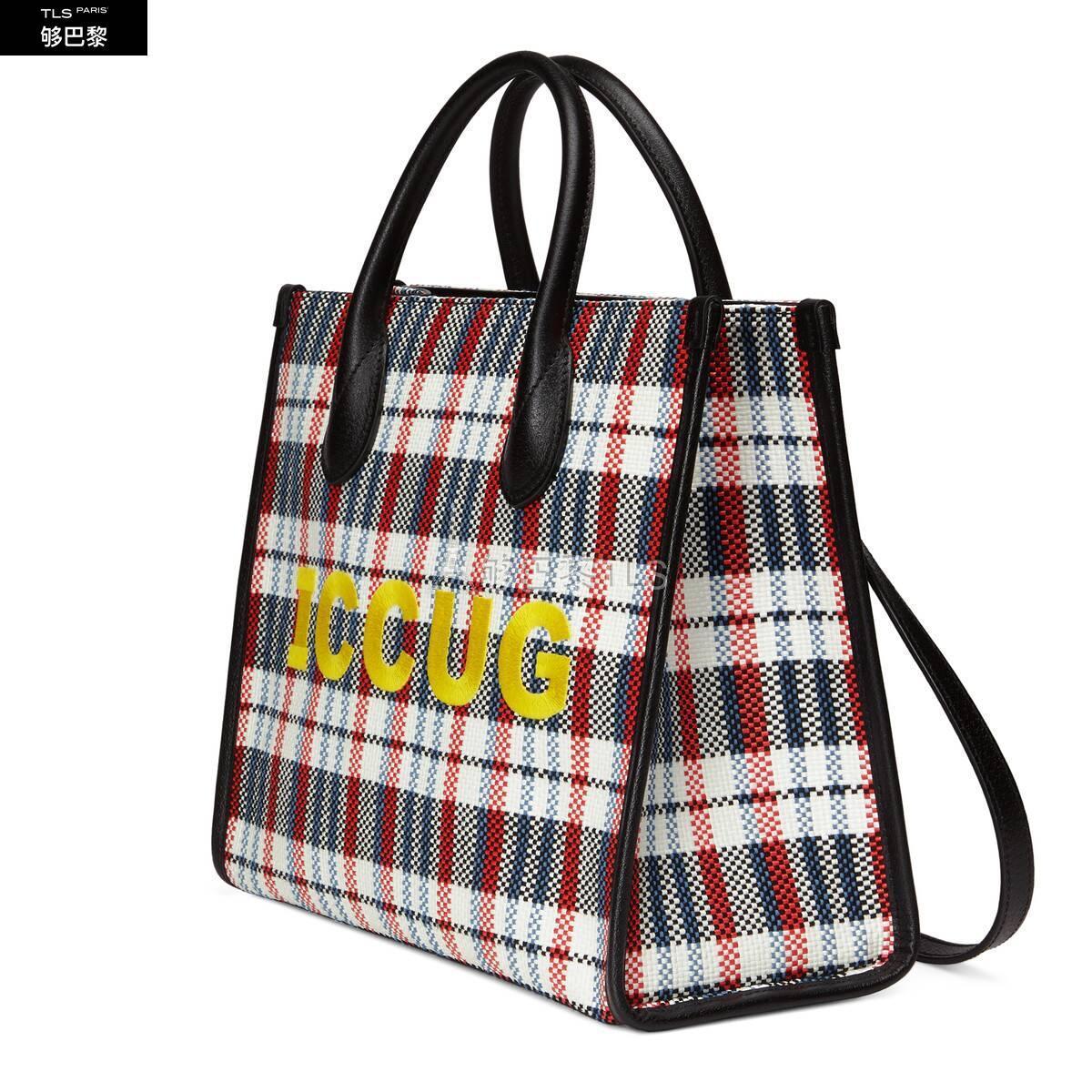 本季全新推出反向显示的Gucci标识图案。这款小号托特包采用格纹尼龙拉菲草面料制作而成,饰以皮革滚边和特别的ICCUG刺绣图案。无边序曲系列传达了时尚拥有更多可能性的理念,也唤起了人们对浪漫的追求和好奇心。