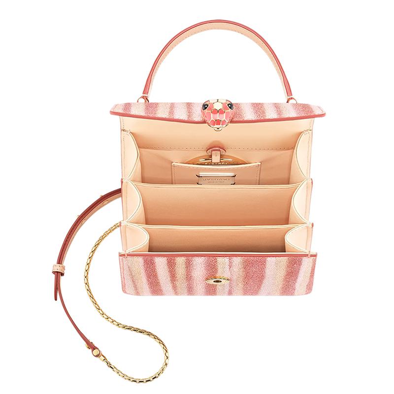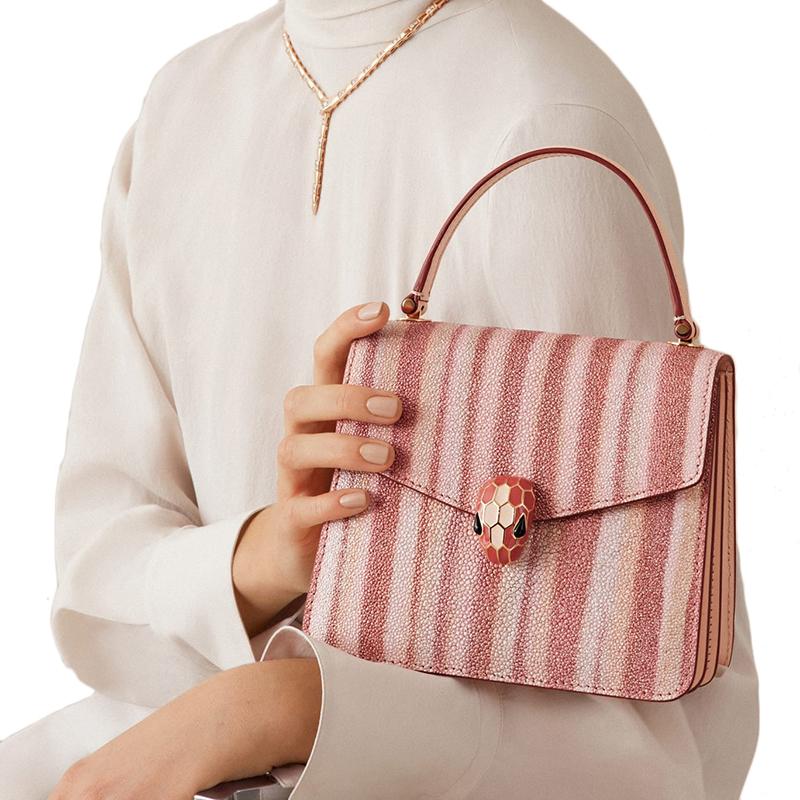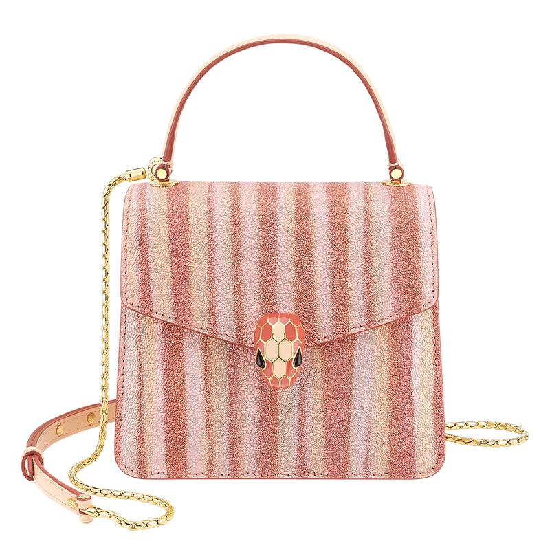 【包税】预定款 BVLGARI/宝格丽 21春夏新款SERPENTI FOREVER系列 女士条纹珍珠鱼皮桃红色小牛皮黑色桃红哑光珐琅扣斜挎单肩包290558