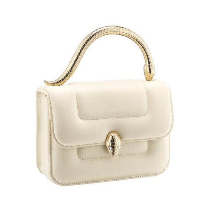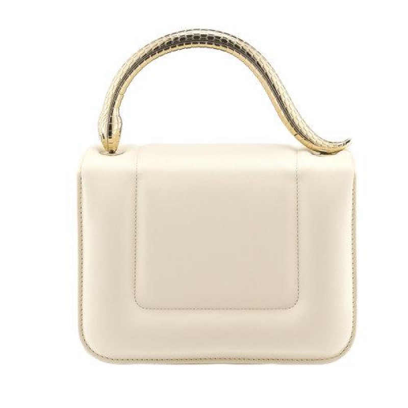 Mary Katrantzou x Bvlgari手提包采用柔软的缝纳帕皮制成,乳白色的象牙白,内部衬里为乳白色的纳帕皮革。新款Serpenti金色黄铜表扣,迷人的水晶眼睛。特别版本。
