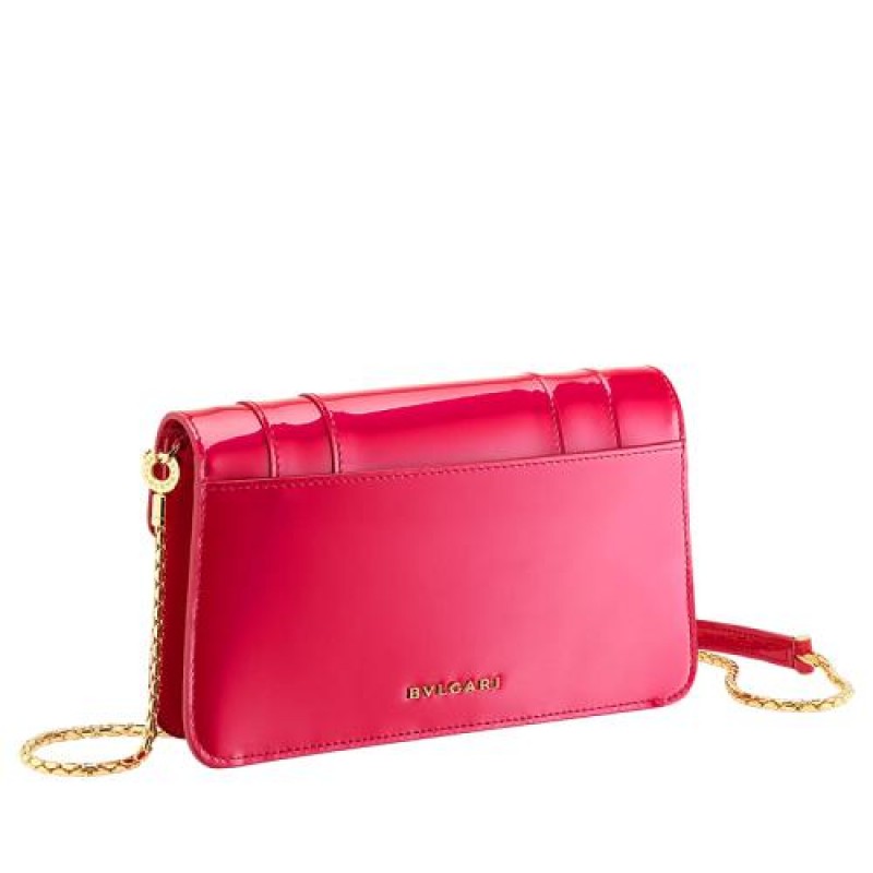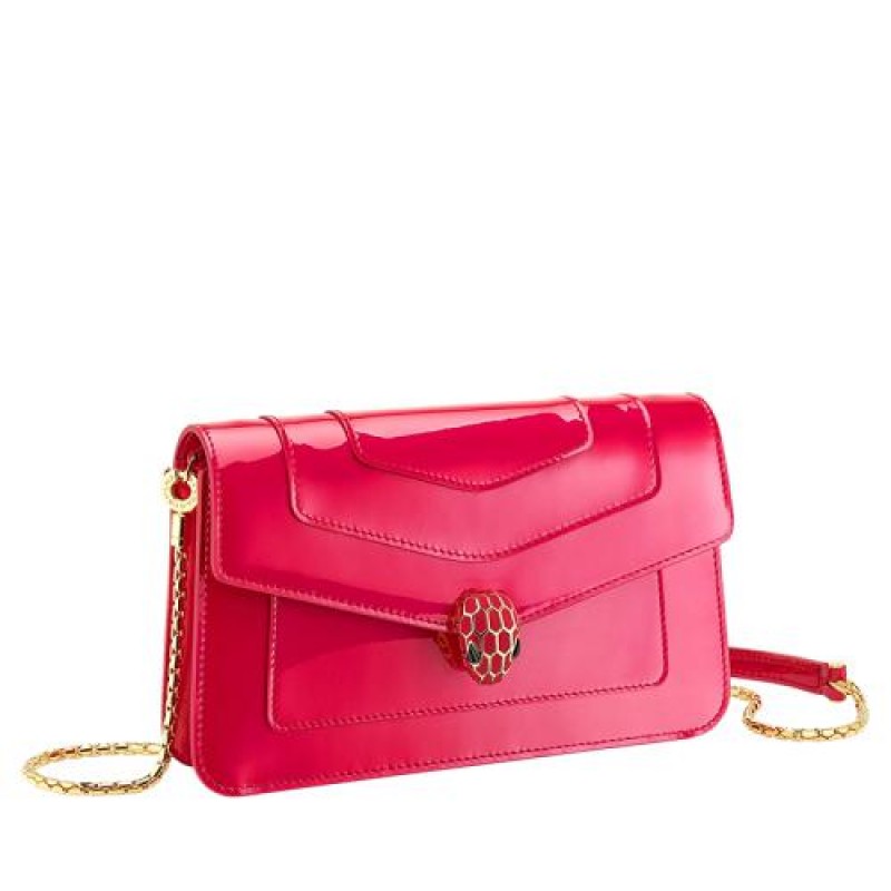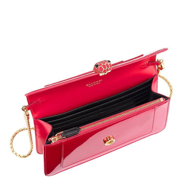 这款新款Serpenti Forever链式钱包采用红色的A菜红石榴石小牛皮制成,具有专利和珍珠效果,侧面采用红色的mar菜红石榴石小牛皮和黑色纳帕皮革制成,并配有金色黄铜细节。这款标志性的Serpenti搭扣采用全哑光Amaranth石榴石红色珐琅制成,并带有y玛瑙眼睛,。模特搭配带扣的隔层,六个信用卡槽和一个内部拉链袋。尺寸:20 x 12 x 4厘米。农历新年特别版