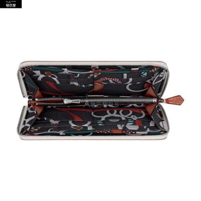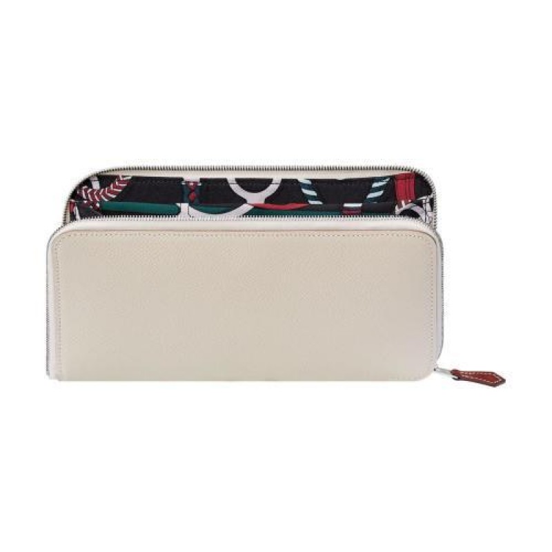 Portefeuille long zippe en veau Epsom, double en twill de soie imprimee « Panoplie equestre », fermeture a glissiere argentee palladiee a l'interieur : un porte-monnaie zippe, douze poches cartes de credit et quatre poche*es