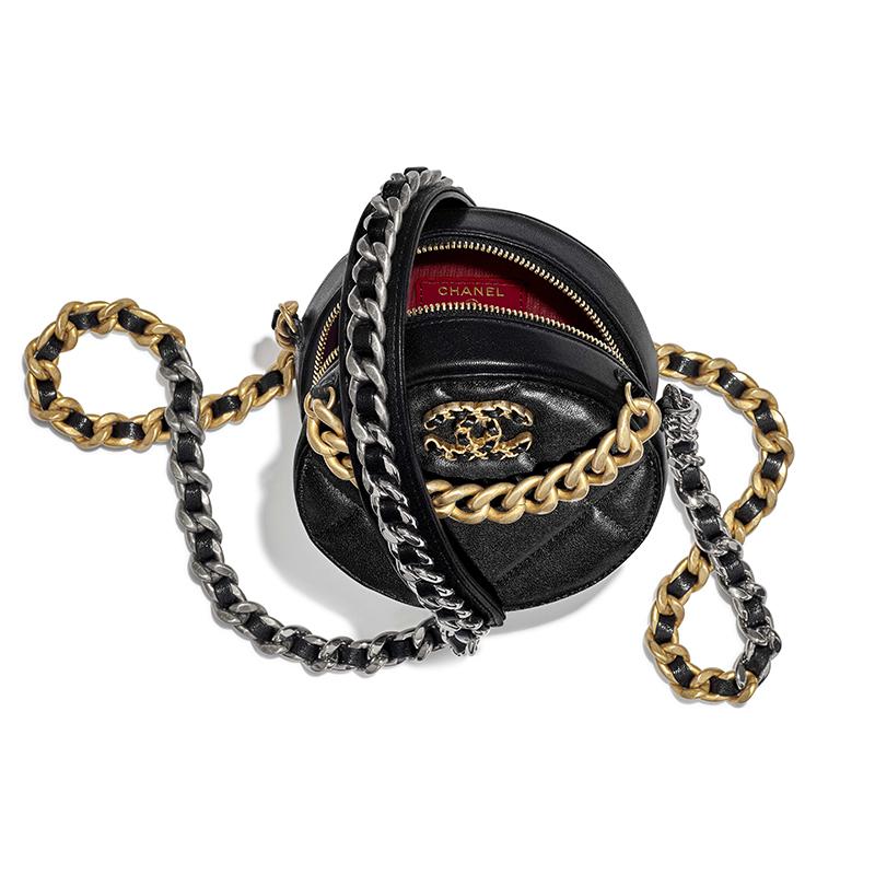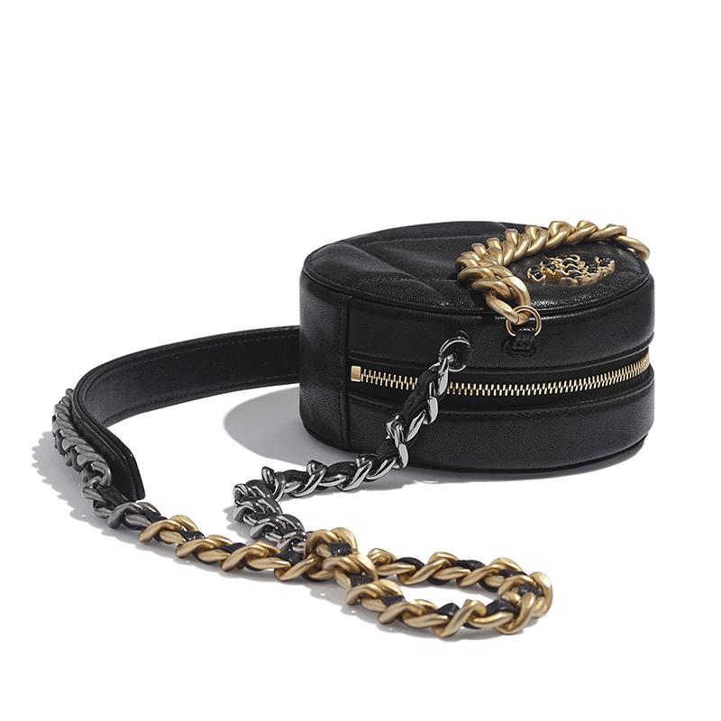 【包税】CHANEL/香奈儿 黑色羊皮大菱格经典CHANEL 19系列 链条圆饼包单肩包