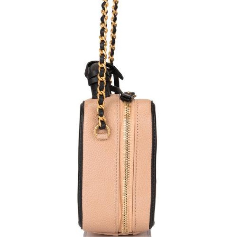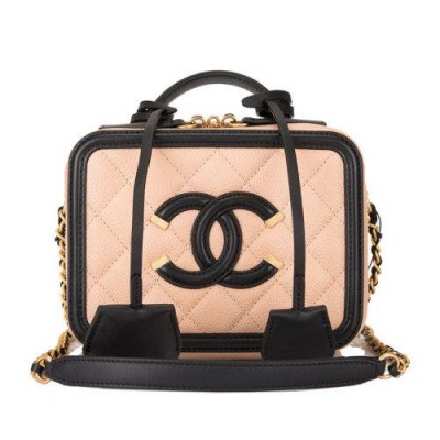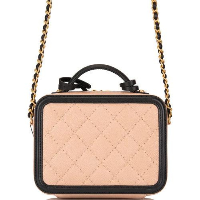 【 Tax included 】 In stock CHANEL/Chanel classic Filigree Vanity Case light beige and black caviar leather gold hardware chain makeup bag shoulder bag