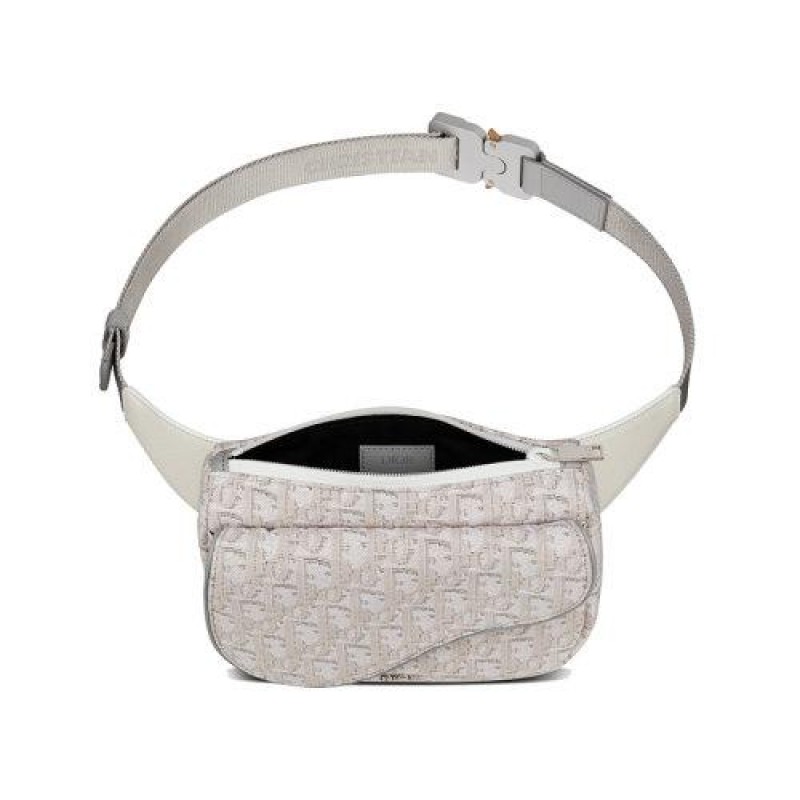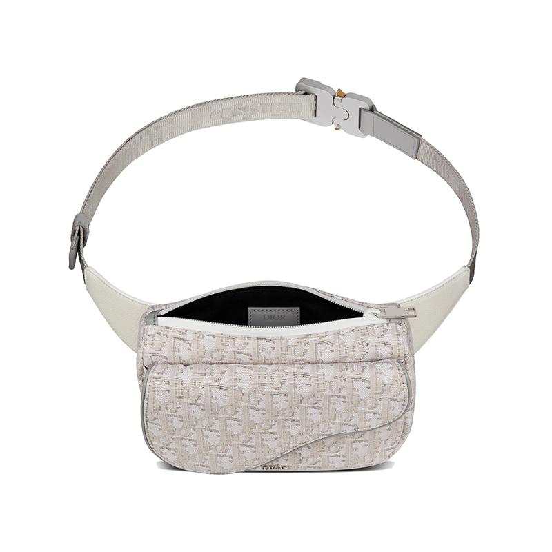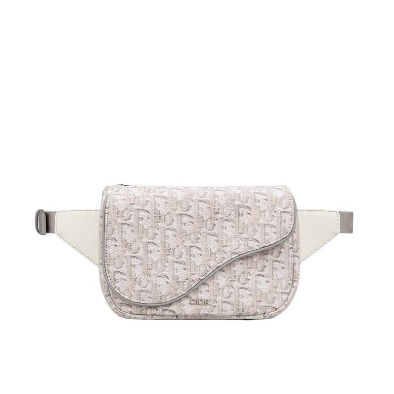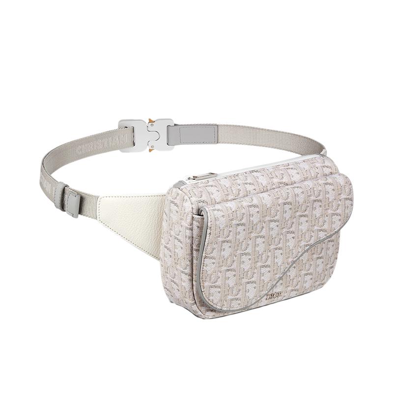【包税】DIOR/迪奥 21春夏新款SADDLE系列 男士灰白色斜纹提花帆布米白色粒面小牛皮磁性翻盖腰包斜挎包1ADPO223YIE_H07E