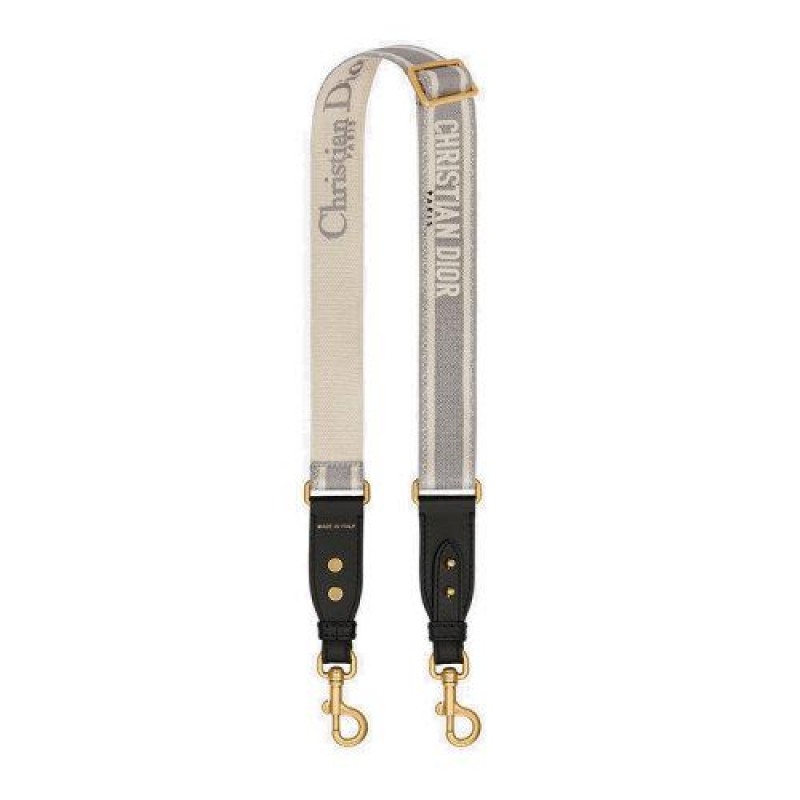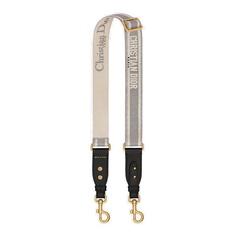 绣花肩带是独特的配件,可让您个性化一些Maison的包包。这款纤巧可调式表款的中央饰有Christian Dior签名,两端饰有黑色小牛皮。两个古董镀金金属登山扣挂钩可将其连接到您喜欢的包上。这款可调节的灰色肩带可以戴在肩膀或斜挎包上,打造出非常个性化的风格。