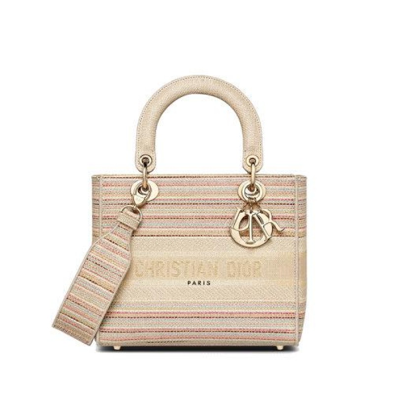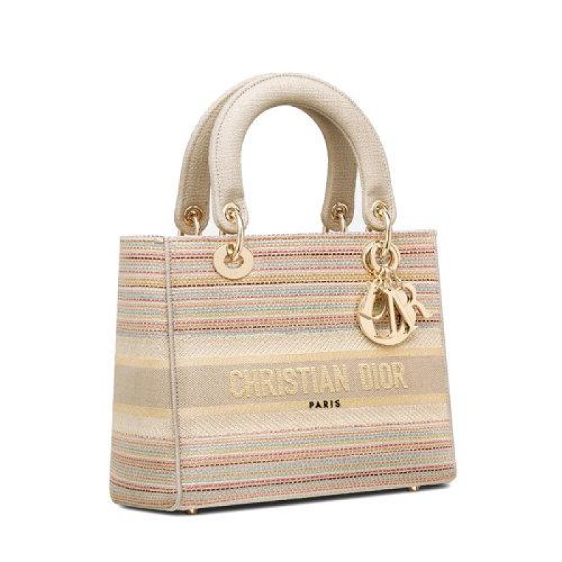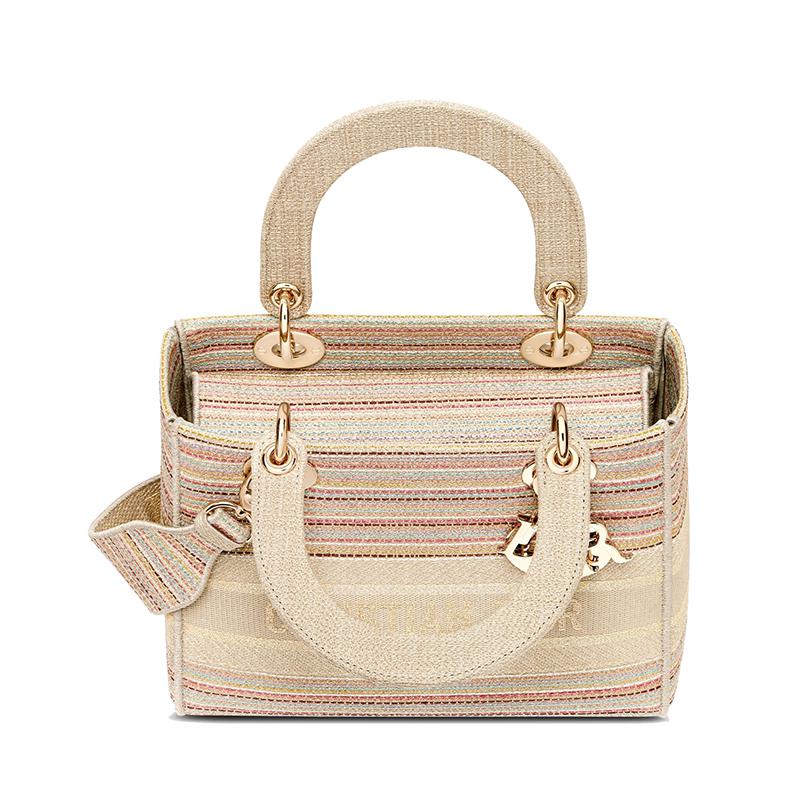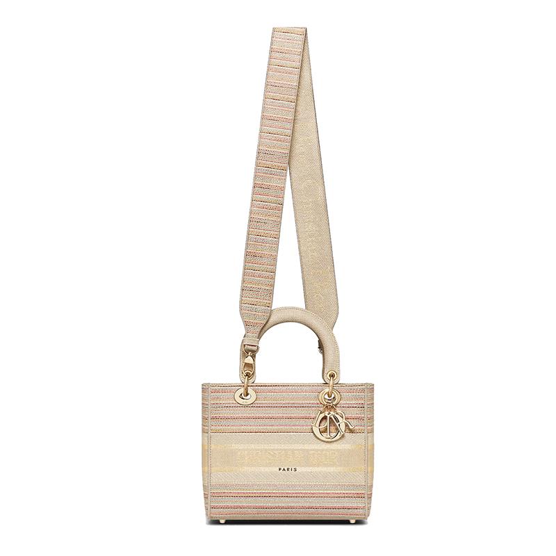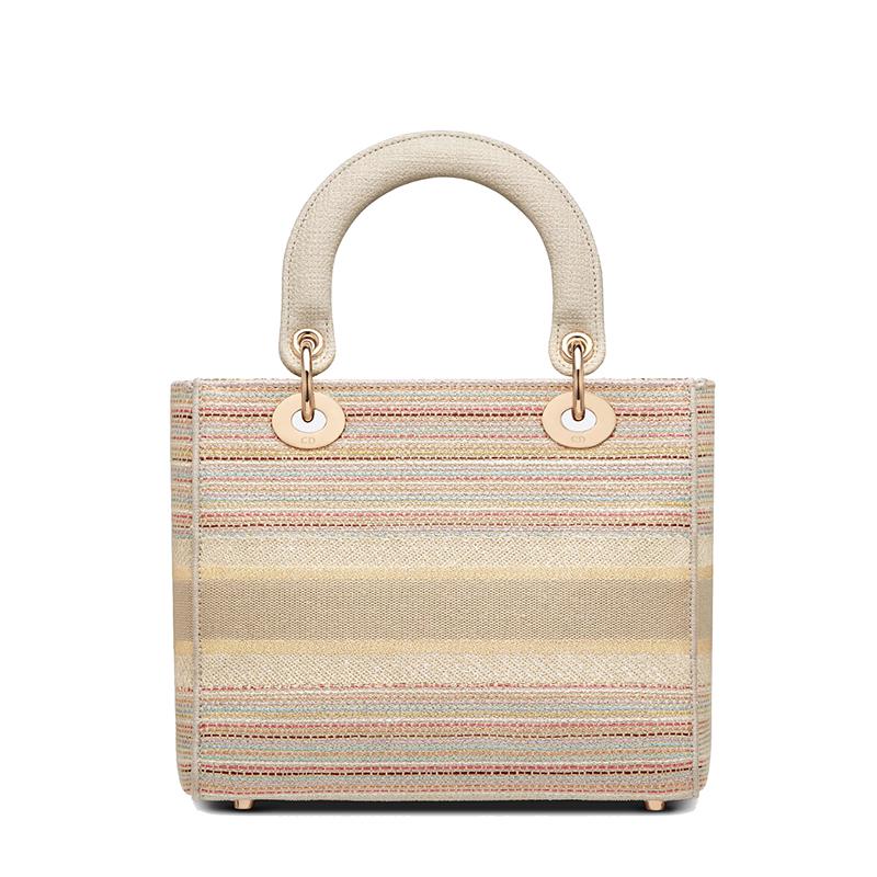【包税】DIOR/迪奥 2021春夏新款 LADY D-LITE系列 女士中号五彩条纹刺绣DIOR浅金色金属饰物可拆卸的肩带手提斜挎单肩包M0565ORFO_M885