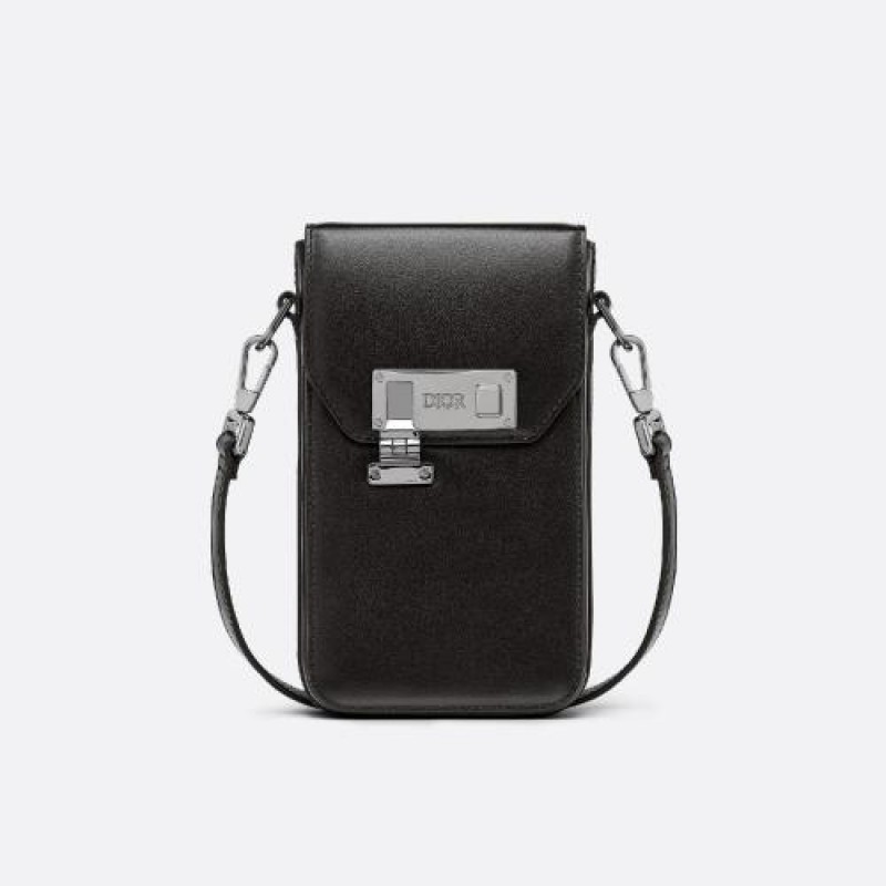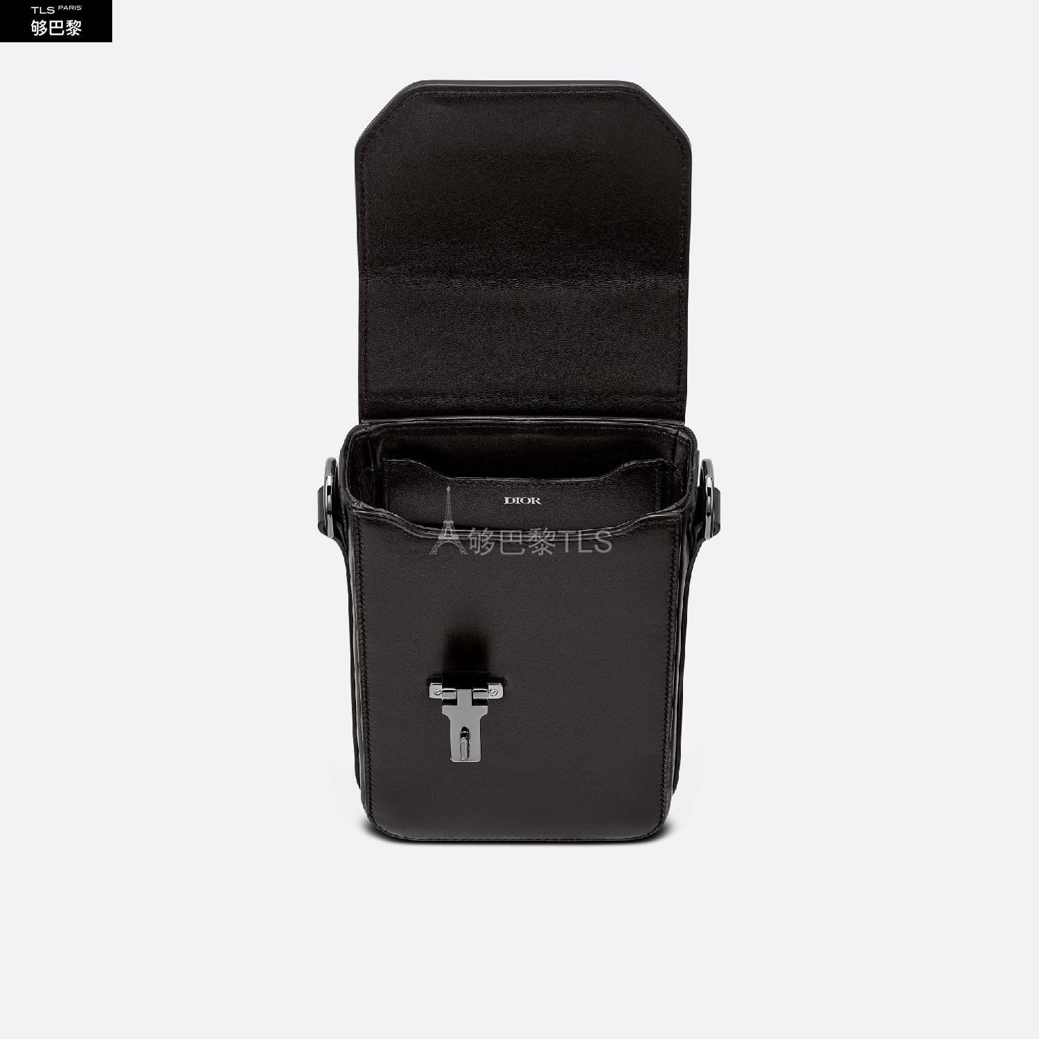 La pochette verticale est une creation au look affirme et a l'elegance intemporelle. Demonstration du savoir-faire maroquinier de la Maison, cette pochette est confectionnee en cuir de veau lisse noir, tres luxueux, a surpiqures contrastees. Le fermoir en laiton finition ruthenium devoile un compartiment interieur avec une poche plaquee, pouvant accueillir deux telephones et un porte-cartes. La bandouliere amovible et reglable en cuir permettra de porter cette pochette autour du cou, en crossbody ou a l'epaule.