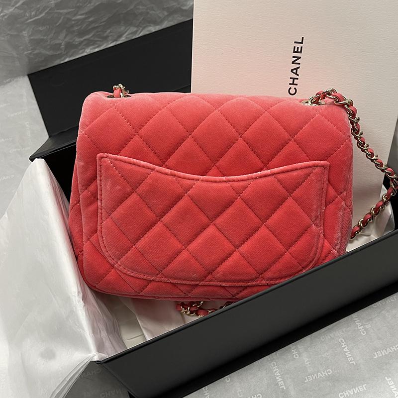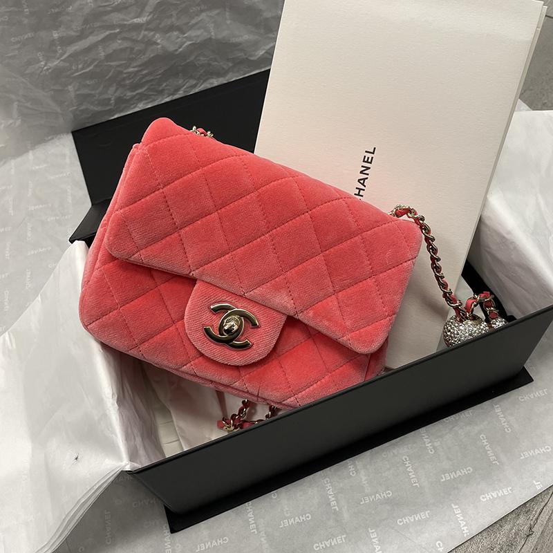 【 Tax included 】 In stock CHANEL/Chanel 2020 autumn/winter hot fashion show pink velvet gold double C embellishment diamond ball diamond grid square fat shoulder bag AS2154432211