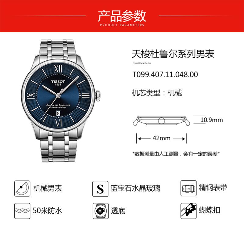 【包税】预定1-2周发货 TISSOT/天梭 杜鲁尔系列精钢表壳表链蓝盘男士自动机械腕表 42毫米
