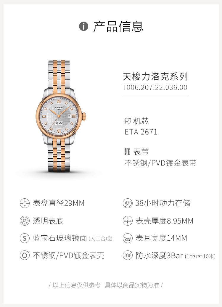 TISSOT/天梭瑞士手表 力洛克系列镶钻自动机械女士腕表 钢带银盘T006.207.22.036.00