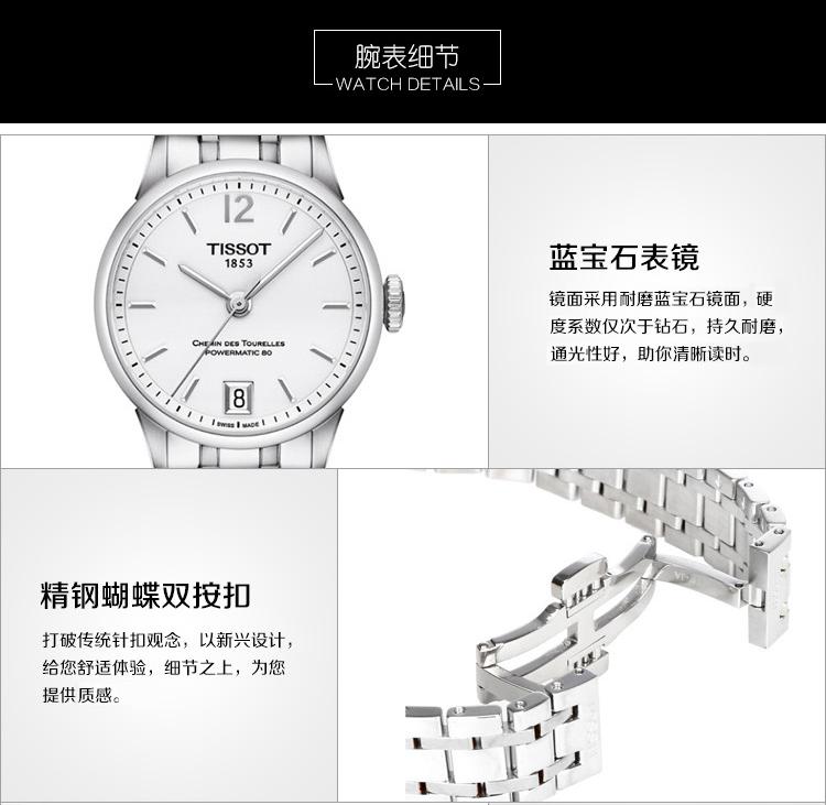 TISSOT/天梭瑞士手表 杜鲁尔系列日历带钻自动机械女士腕表 钢带银盘T099.207.11.037.00