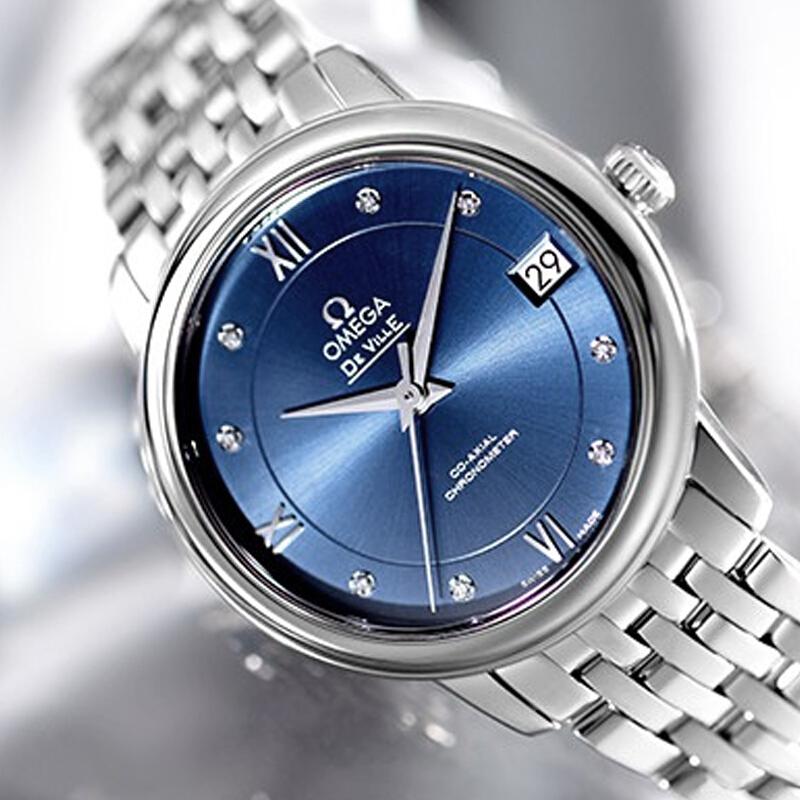 OMEGA/欧米茄瑞士手表 碟飞系列日历镶钻自动机械女士腕表 钢带蓝盘424.10.33.20.53.001