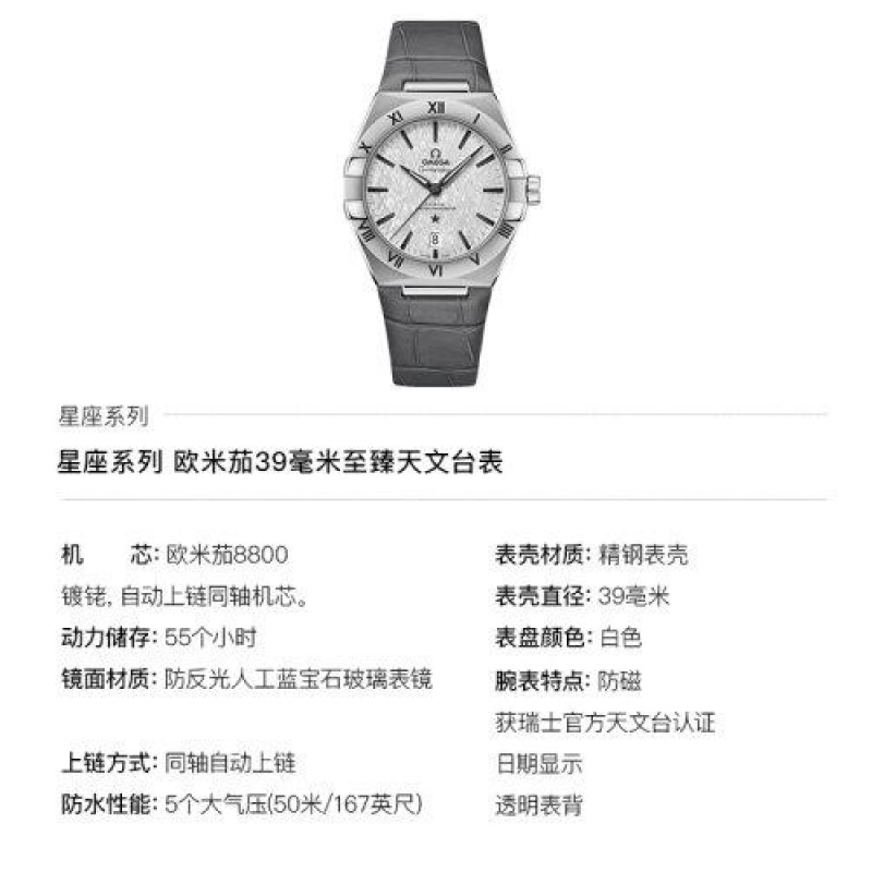 OMEGA/欧米茄瑞士手表 星座系列日历自动机械机芯商务防磁男士腕表 皮带灰盘131.13.39.20.06.001