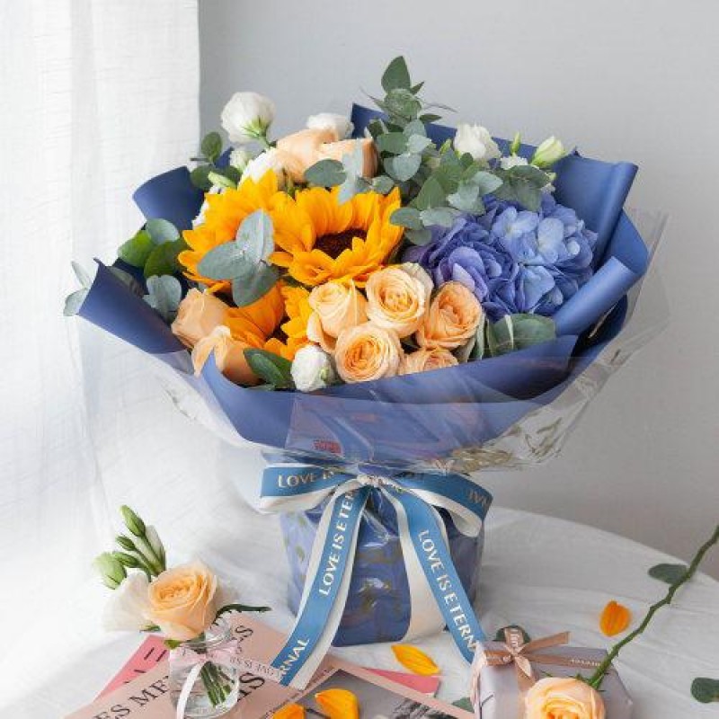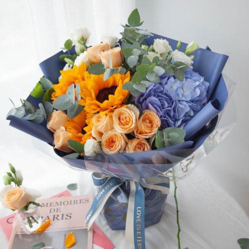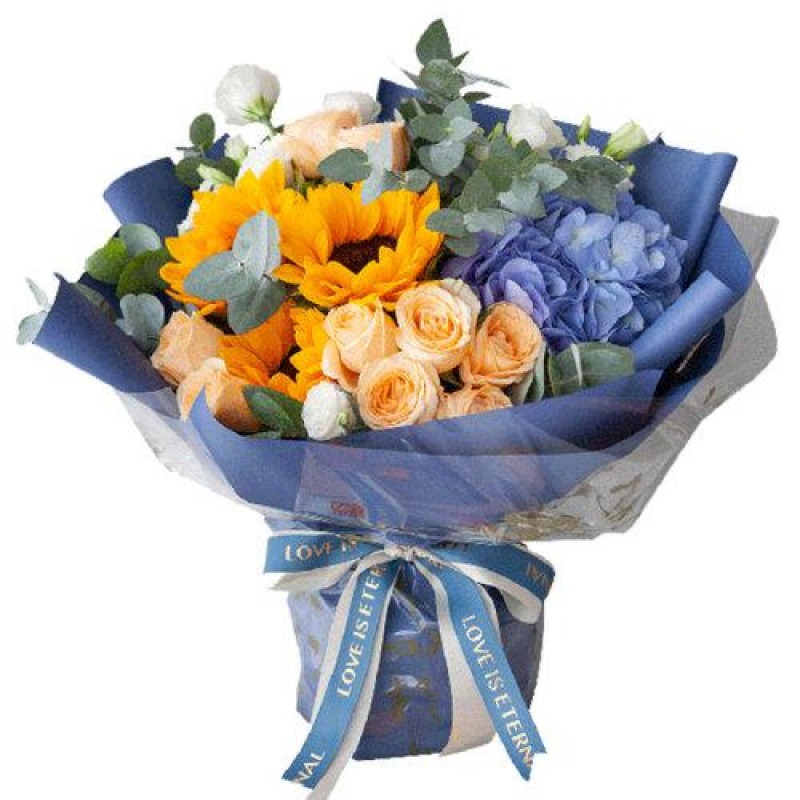 花礼/星河璀璨/香槟玫瑰9枝、蓝绣球、向日葵、白色洋桔梗、大叶尤加利/七夕情人节礼物鲜花/当日达