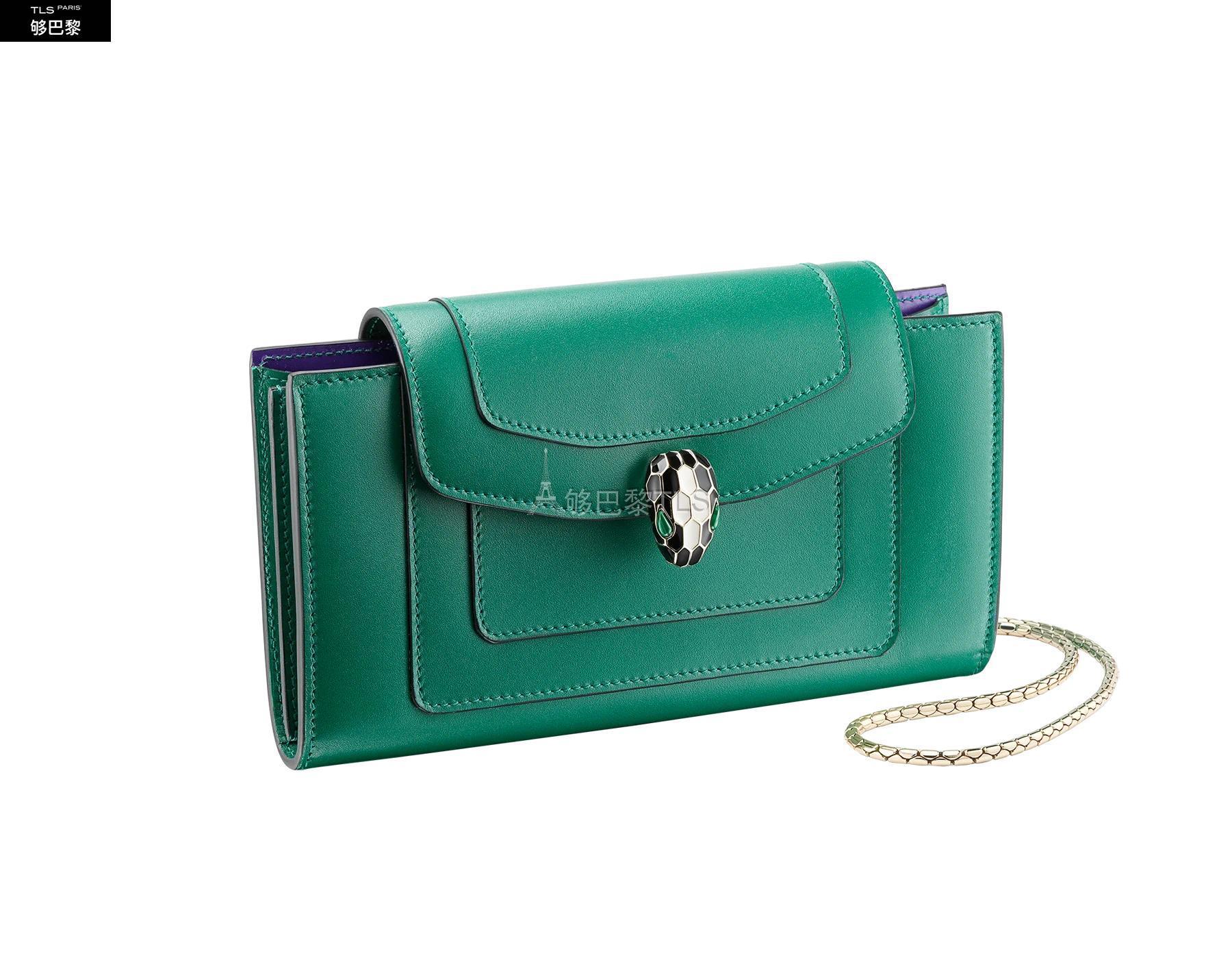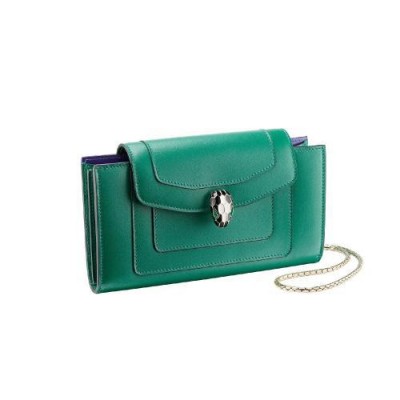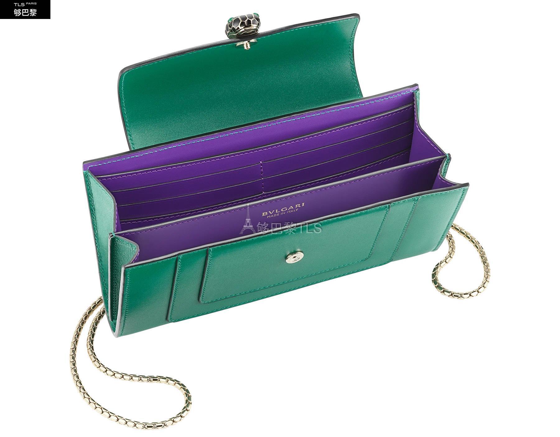 Pochette Serpenti Forever en cuir de veau vert émeraude a l’exterieur et couleur violet Petunia a l’interieur. Fermoir Serpenti en laiton dore et email noir et couleur blanc Agate avec yeux en malachite. Une chaine en forme de serpent amovible, deux compartiments a soufflet dont un pour smartphone, une poche ouverte et huit emplacements cartes de credit completent l’ensemble. Dimensions : 19 x 11,5 x 3,5 cm.