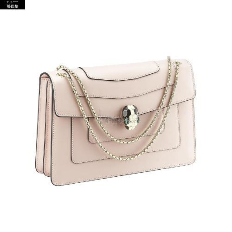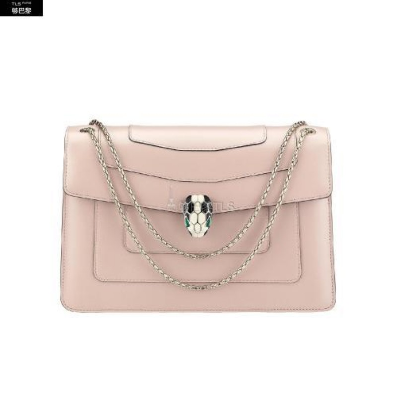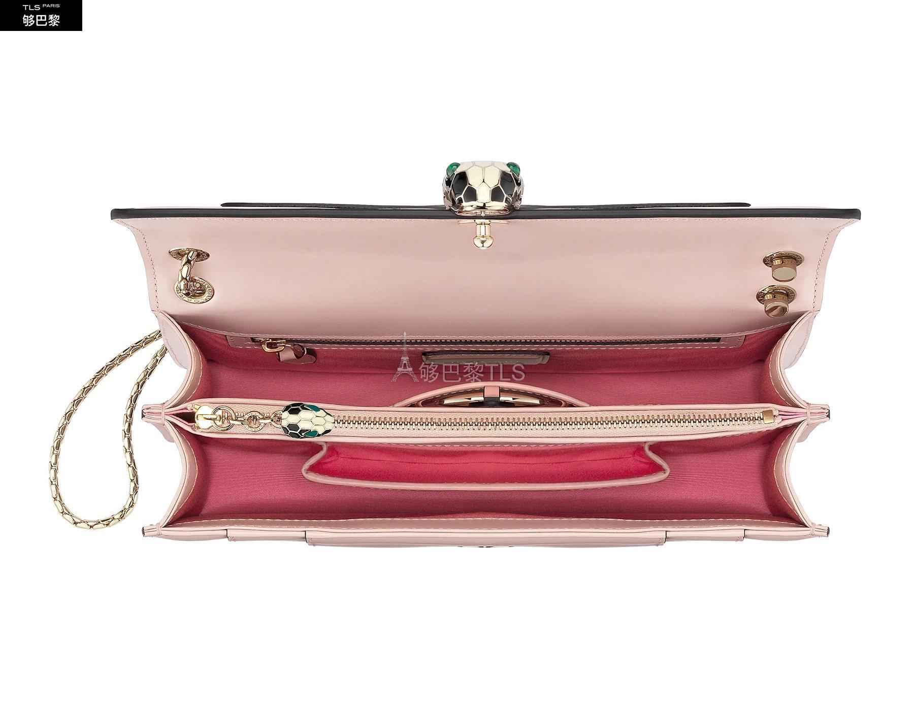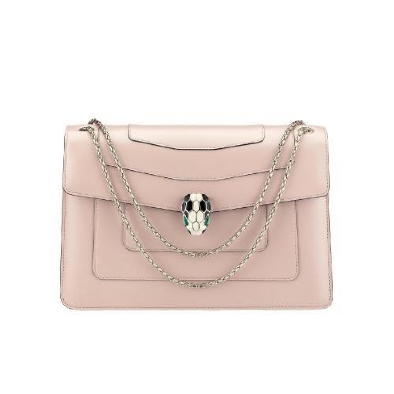 Le sac a bandouliere Serpenti Forever s'habille de nouvelles couleurs tendance. Ce modele en cuir de veau lisse couleur Crystal Rose est rehausse de details en laiton dore. Le fermoir emblematique Serpenti en email noir et blanc hypnotise avec ses yeux en malachite au cha*W*rme envoutant. Une chaine en laiton dore, inspiree par les ondulations du corps du serpent, et un petit miroir de poche completent l'ensemble. Moyen modele dote de deux compartiments a soufflet, de plusieurs poches interieures et d'une plaque en metal ornee du logo Bvlgari a l'interieur. Dimensions : 28 x 19 x 7,5 cm