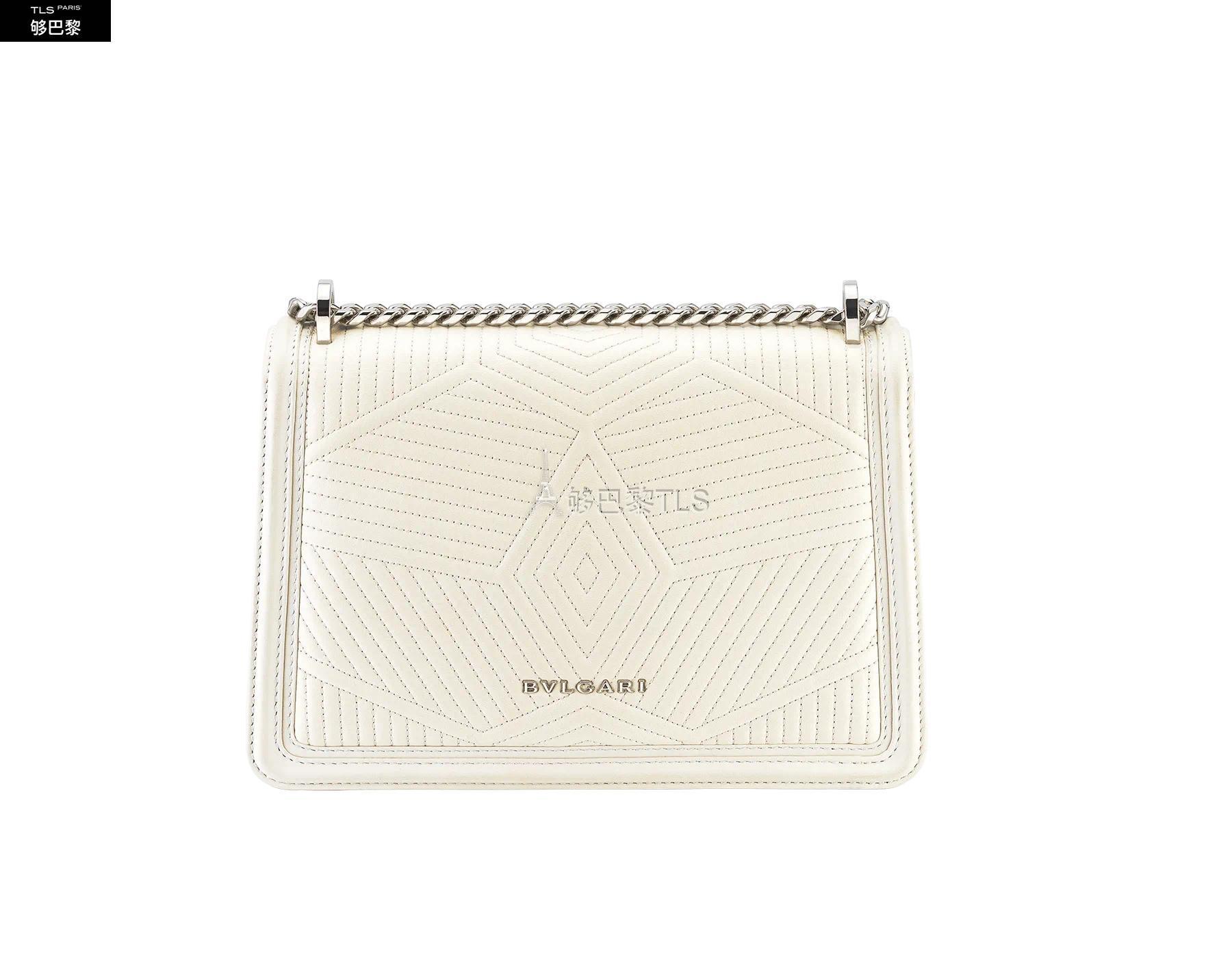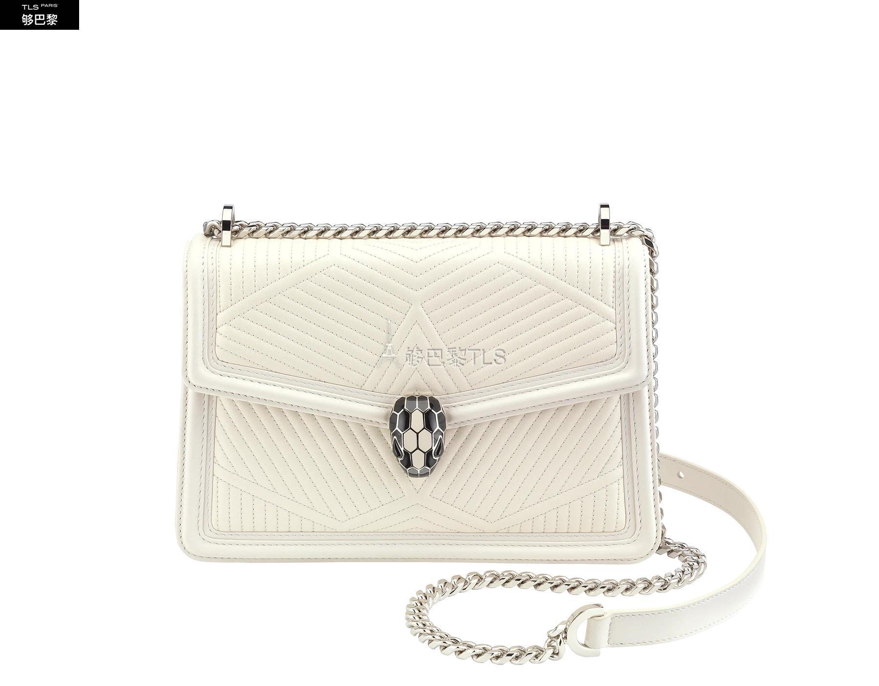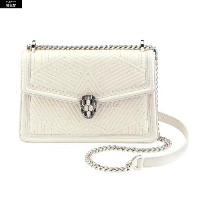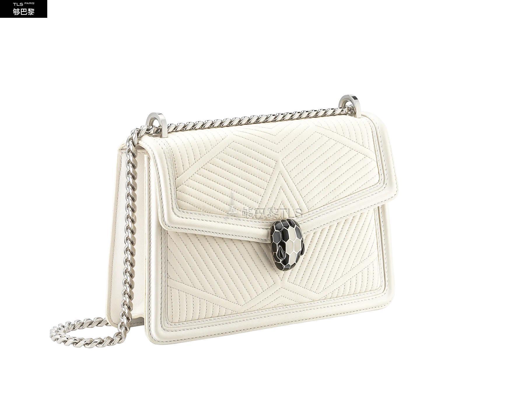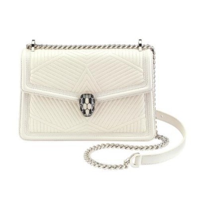 Caracterise par des lignes nettes contrastant avec originalite avec un motif exclusif legerement *w*matelasse, le sac a bandouliere Serpenti Diamond Blast est revisite cette saison dans une version tout en blanc. Le corps du sac en cuir nappa couleur blanc agate est habille d'un motif *w*matelasse en trois dimensions, inspire des nombreuses facettes d'un diamant brillant, tandis que son profil externe est rehausse d'un pourtour geometrique en cuir de veau ton sur ton. Fermoir emblematique Serpenti en laiton dore et email noir et blanc avec yeux en onyx elegants. Accessoire ideal d'un look de jour sophistique, le sac se pare d'une chaine epaisse et d'une bandouliere en cuir ajustable pour plus de polyvalence. Petit modele dote d'un compartiment a soufflet, d'une poche a fermeture eclair a l’interieur et d'une poche plate. Plaque en metal ornee du logo Bvlgari a l’interieur
