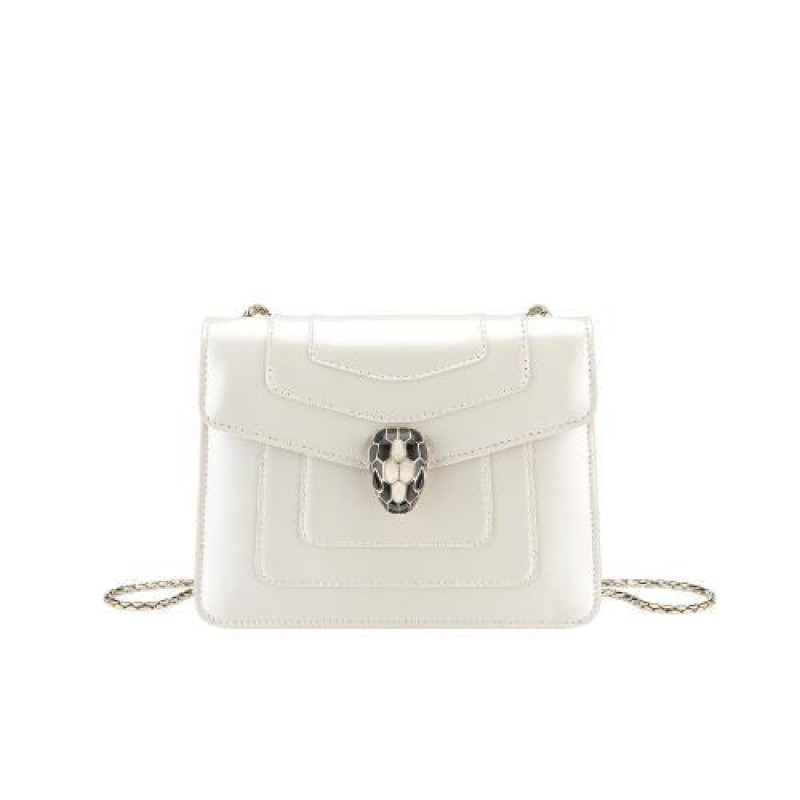Ce sac bandouliere Serpenti Forever en cuir de veau couleur blanc Agate a effet verni et perle est rehausse de details en laiton dore. Le fermoir Serpenti seduisant en email noir et couleur blanc Agate perle hypnotise avec ses yeux en onyx au cha*W*rme envoutant. Petit modele dote d’un compartiment a soufflet et d’une chaine en laiton dore inspiree par l’allure sinueuse du serpent. Une poche a miroir a l’interieur et un petit miroir personnalisable completent l’ensemble. Dimensions : 20 x 14 x 4,5 cm.